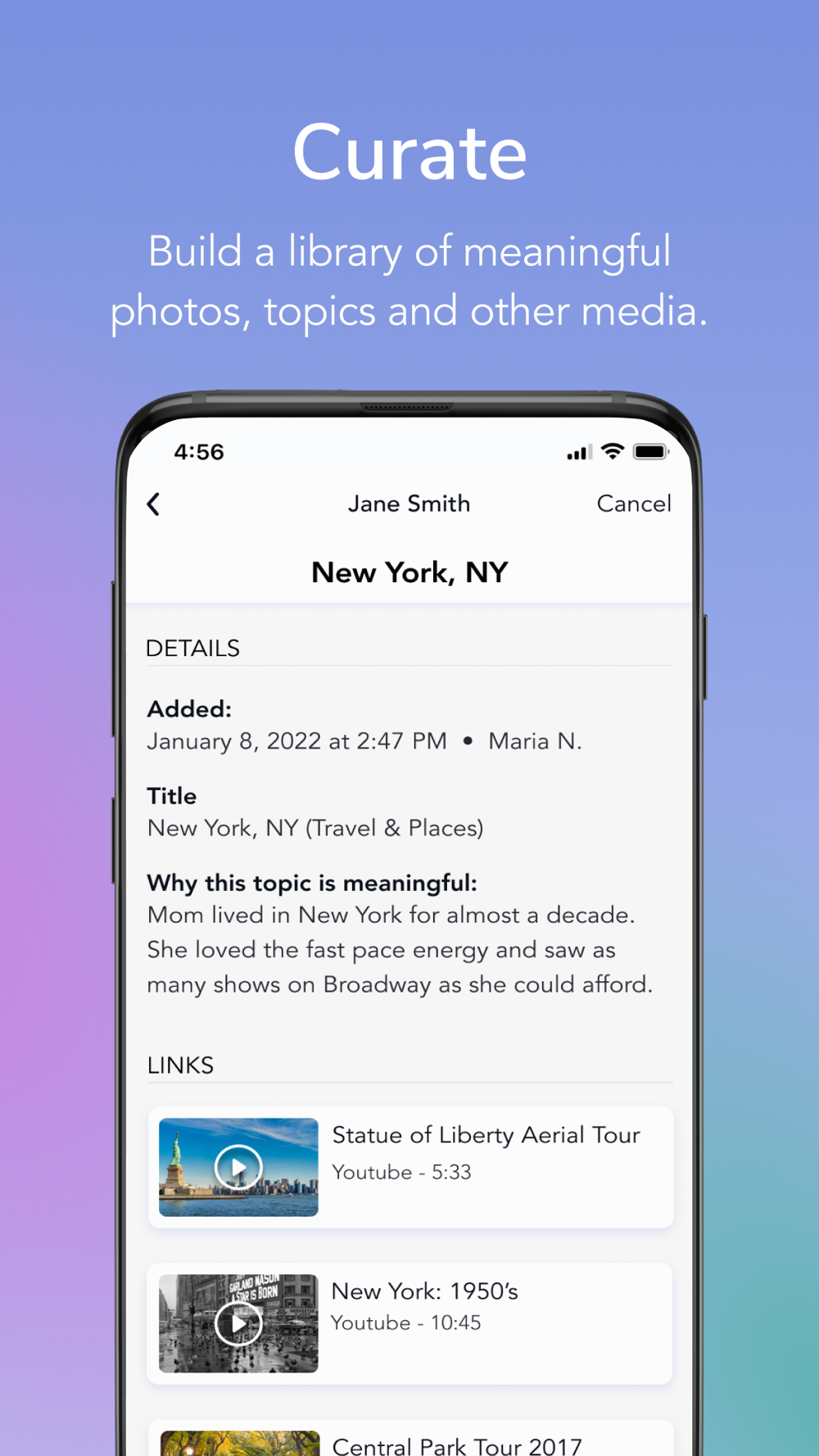 The GC app is a digital therapeutic designed to help people with dementia and their care partners limit behavioral symptoms by prompting evidence-based practices. Healthcare professionals and family caregivers collaborate to help people living with dementia establish therapeutic routines and rituals, involving social customs & outings, personalized music, cognitive stimulation, reminiscing, relaxation, and physical activity.
