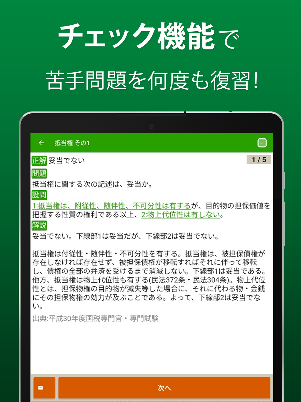 基本の一問一答から本番形式まで、全問題、解説付き!チェックを入れた問題をまとめて復習できる機能も!