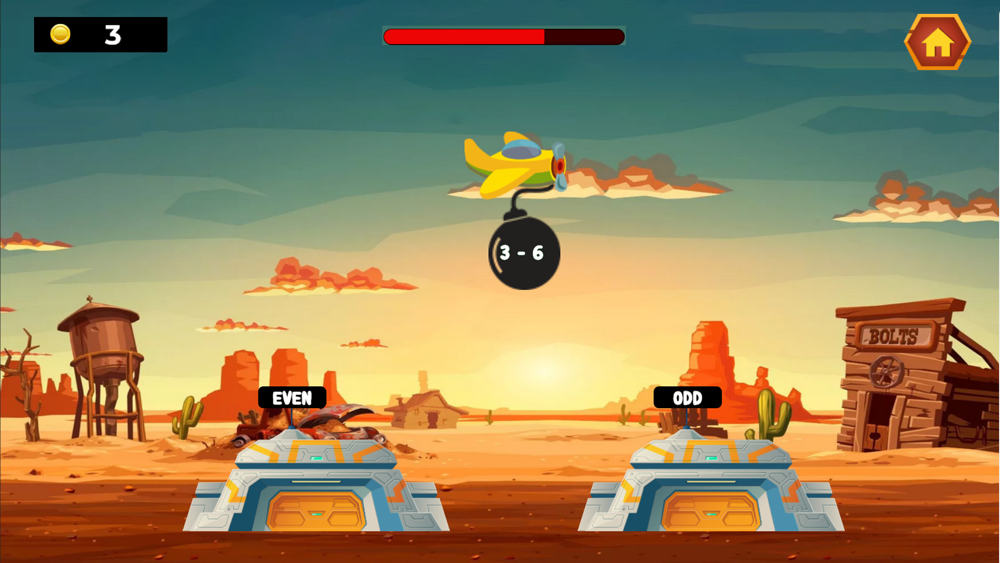 Enemy aircraft fly from one of the two sides of the screen to another direction, on the plane there will be 1 bomb containing the calculation, on the ground there will be 2 bases (One side has even letters, the other side has odd numbers). ) the player's task is to calculate the calculation on the plane's bomb, then tap the plane to drop the bomb on the correct block or odd square as the result of the calculation. If you fall correctly, you will gain points, if you fall incorrectly, you will lose 1 health, for a total of 3 health