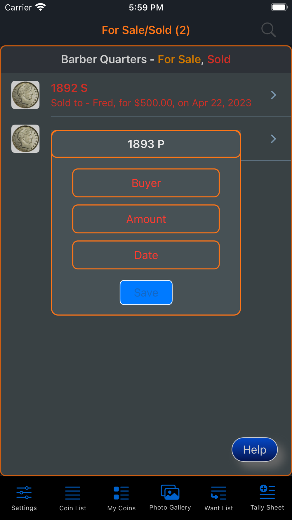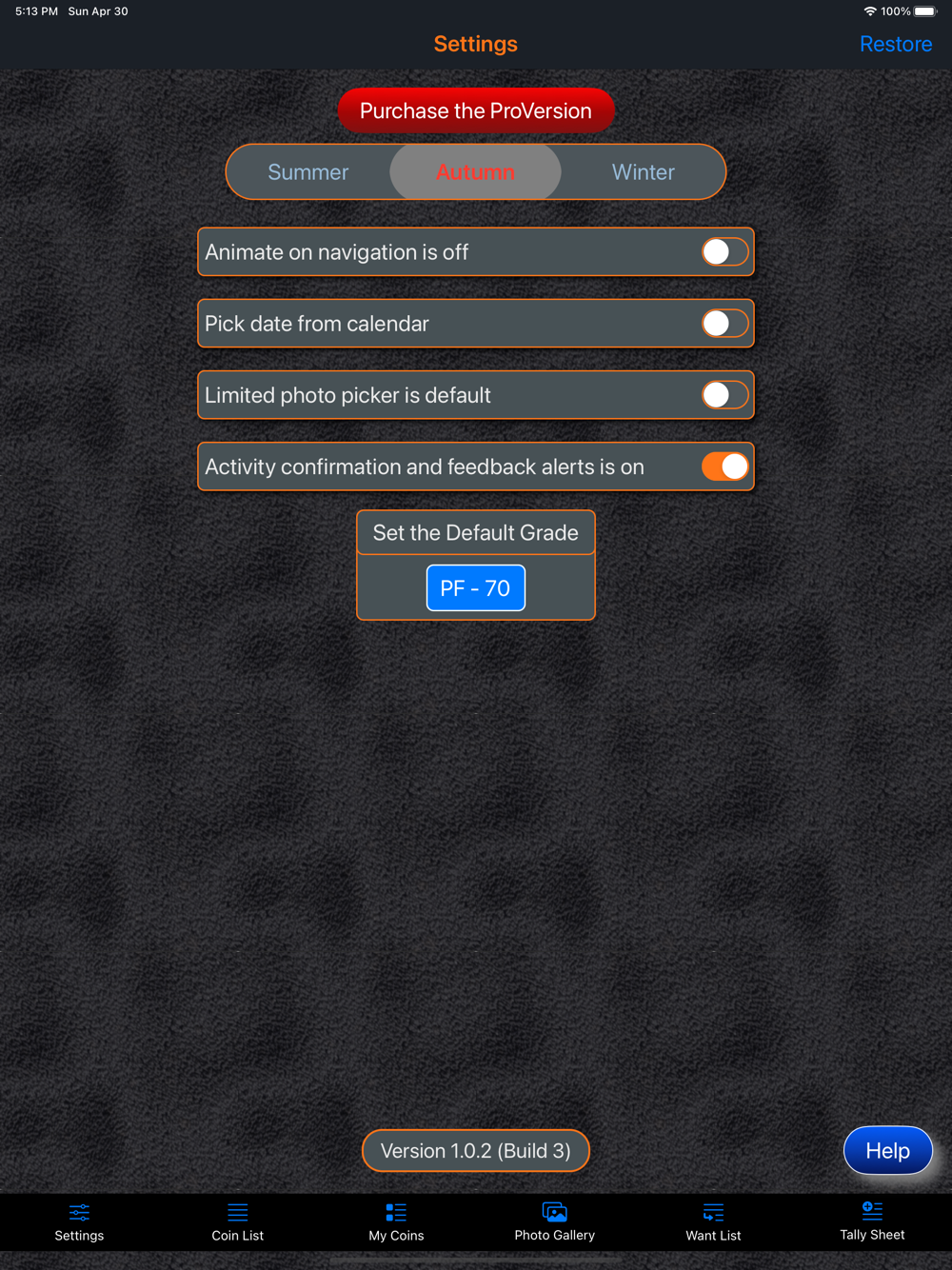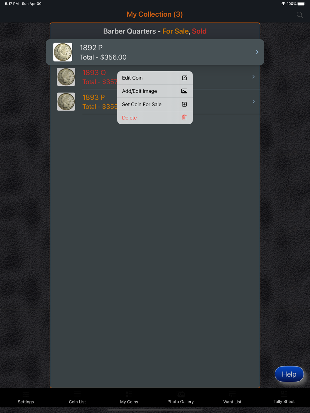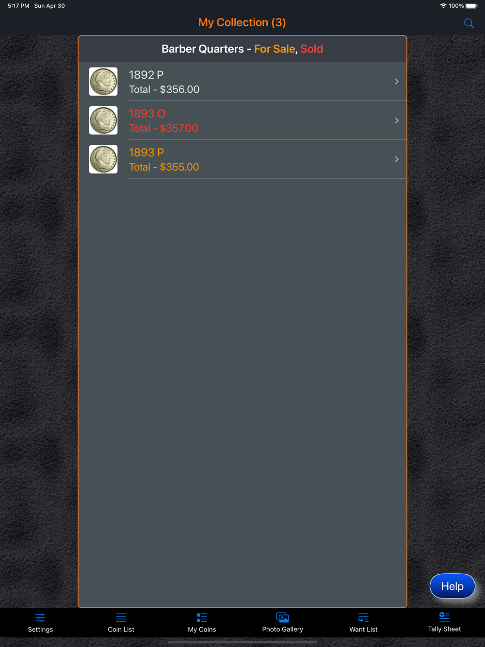 This app will provide the ability for the user to organize, track and manage their collection of coins. Images of each coin can be included with the collection. There is also a means within the app for the user to peruse all of the images in an entertaining manner. The app has three (3) color themes which help to make the app more enjoyable. A running tally of the cost for the entire collection is provided. A want list is also included in the app to allow you to ear-mark coins that you are searching for.