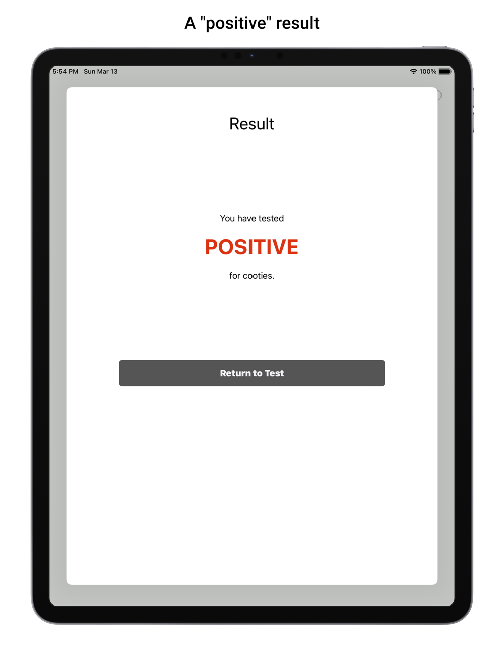 - Press the "Start Test" button. If you tap the left side of the button, you will get a "negative" test "result"; if you tap the right side of the button, you will get a "positive" test "result."