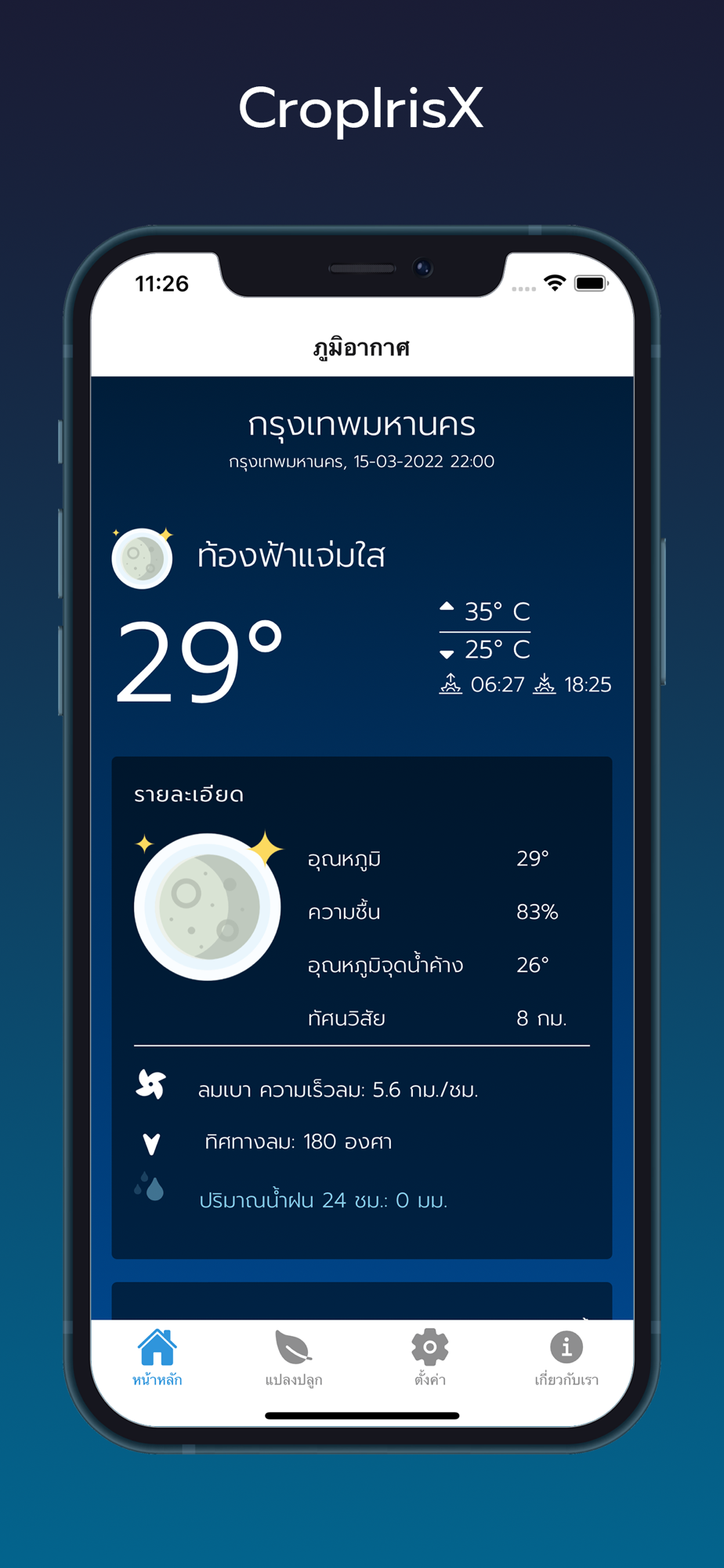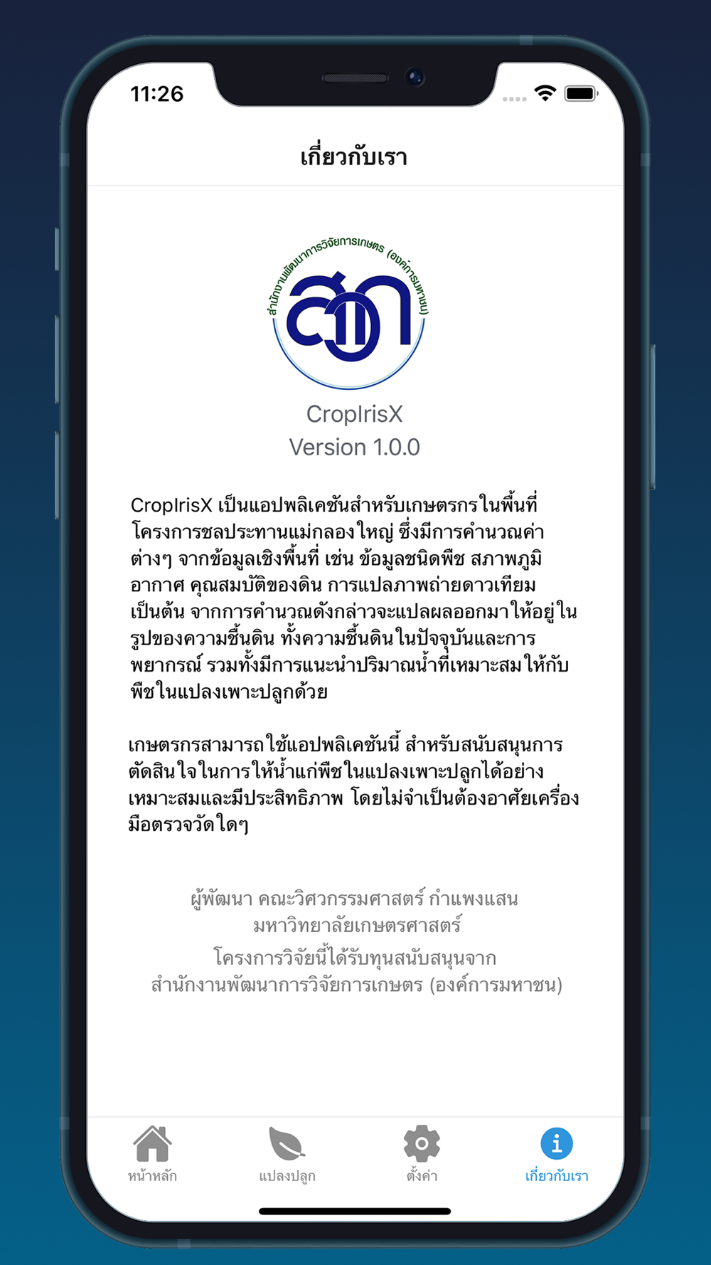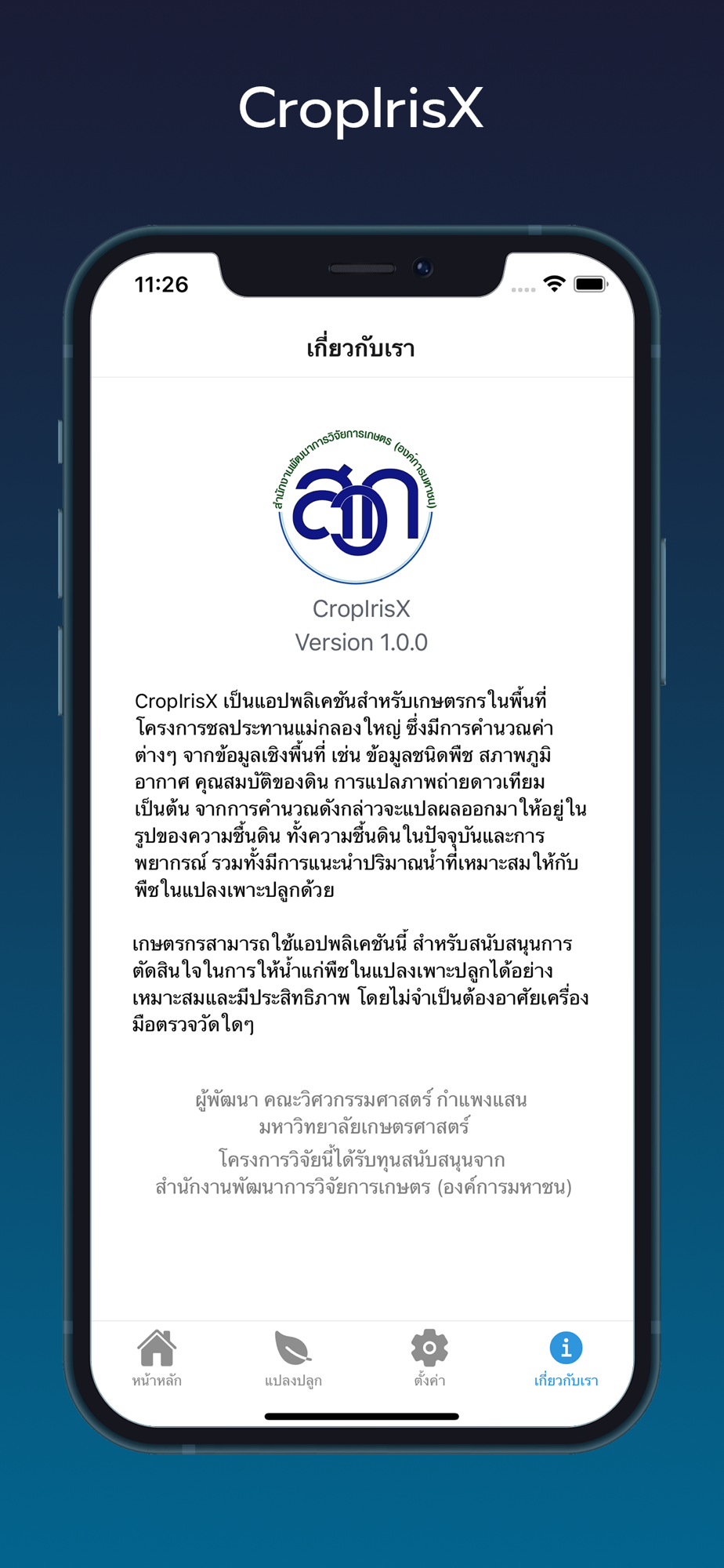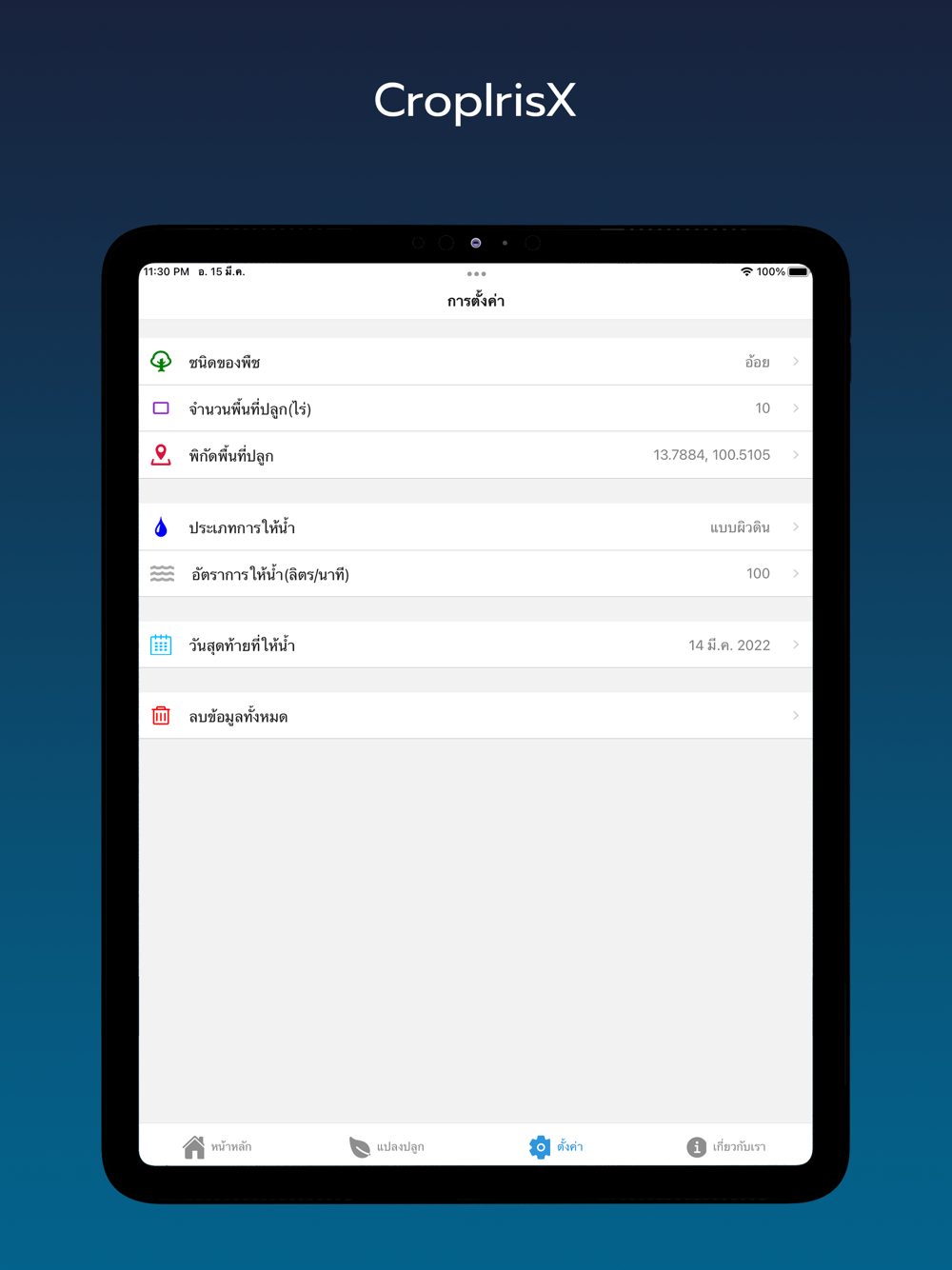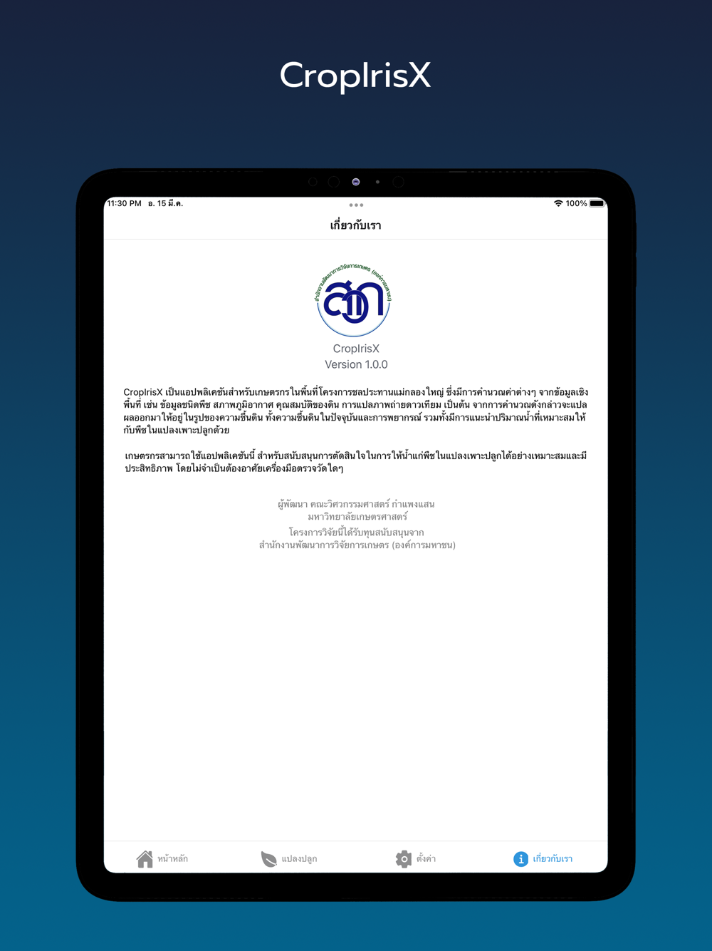 CropIrisX เป็นแอปพลิเคชันสำหรับเกษตรกรในพื้นที่โครงการชลประทานแม่กลองใหญ่ ซึ่งมีการคำนวณค่าต่างๆ จากข้อมูลเชิงพื้นที่ เช่น ข้อมูลชนิดพืช สภาพภูมิอากาศ คุณสมบัติของดิน การแปลภาพถ่ายดาวเทียม เป็นต้น จากการคำนวณดังกล่าวจะแปลผลออกมาให้อยู่ในรูปของความชื้นดิน ทั้งความชื้นดินในปัจจุบันและการพยากรณ์ รวมทั้งมีการแนะนำปริมาณน้ำที่เหมาะสมให้กับพืชในแปลงเพาะปลูกด้วย