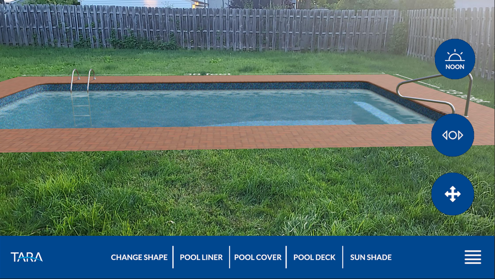 The Envision AR app from Tara brings the power of augmented reality to your pool design process. Using your camera, the app allows you to place a pool in your backyard, giving you a sense of the size and area, you will need. Select a pool shape and then position it in your yard. Move it and rotate it to find the best location. Browse our entire pattern collection filled with the most incredible selection of styles, colors and designs. Choose any pattern and see how it will match the colors of your backyard. Envision AR shows you how the pool liner looks in water or remove the water with a touch of a button. You can spin the pool around to see it from every angle and change the time of day to experience different lighting conditions.