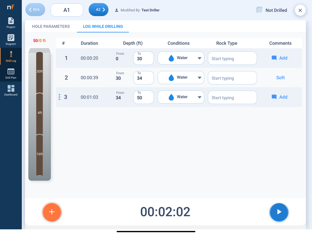 * Drill Log View the designed blast in the drill log view and add real-time drill data. Use the log while drilling feature to time and record drilling segments while you drill.