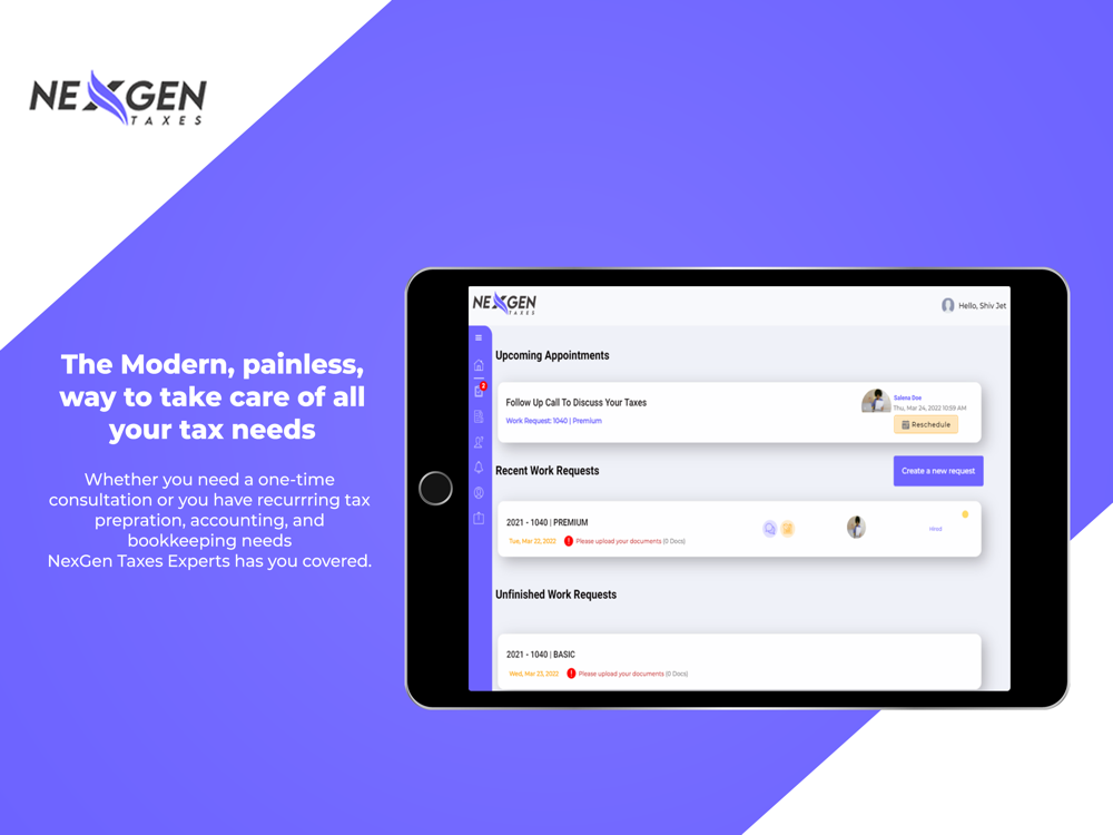 Tired of waiting to get your taxes done and need professional help? Get in touch with a Certified Tax Pro with NexGen Taxes tax filing platform any time of the year. The Pros in NexGen Taxes On-Demand platform can take care of your Personal and Business tax filing, Accounting and Bookkeeping needs.