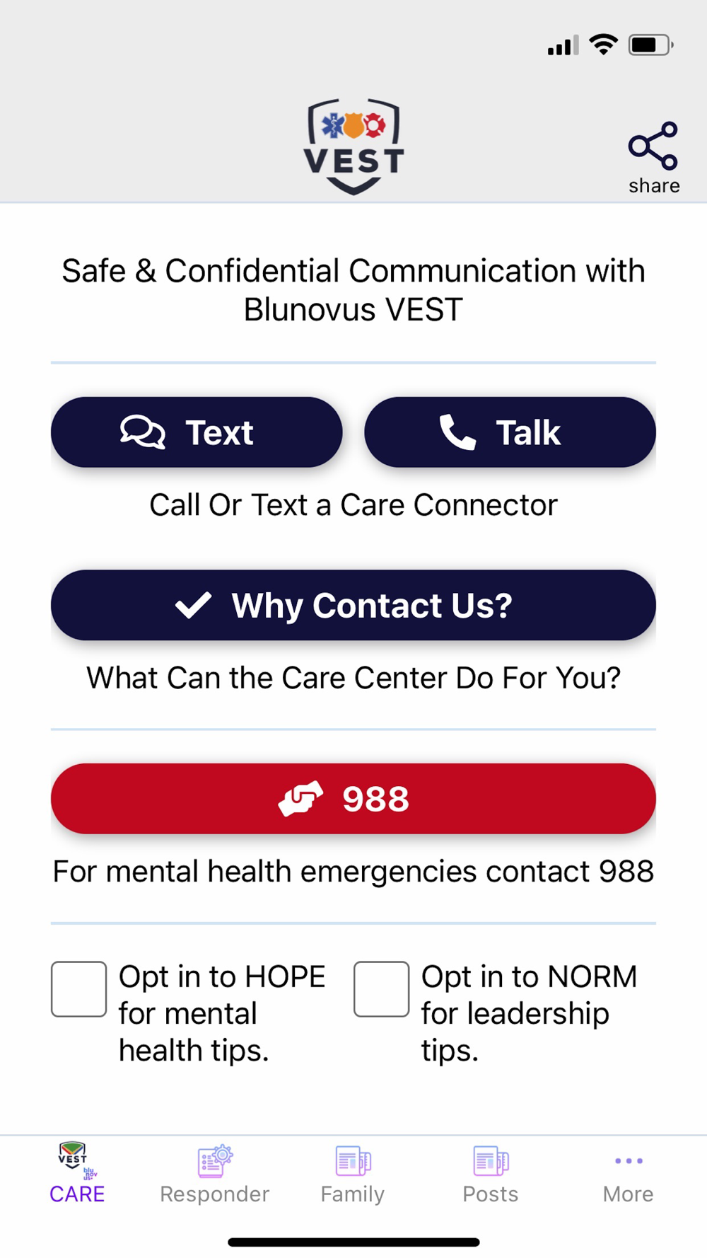 VEST First Responder helps individuals avoid burnout and avert crisis by providing in-the-moment connections to peer support, ready access to first responder specific expert mental and emotional training, and access to professional counseling when appropriate.