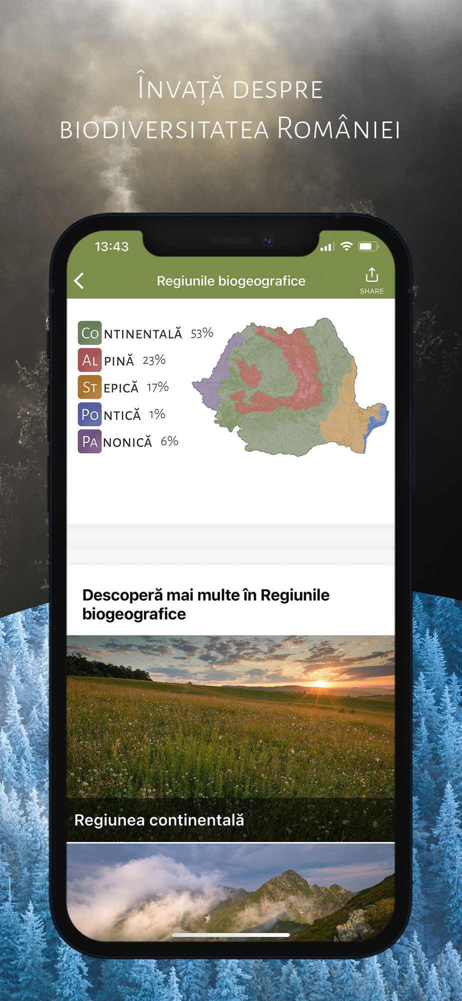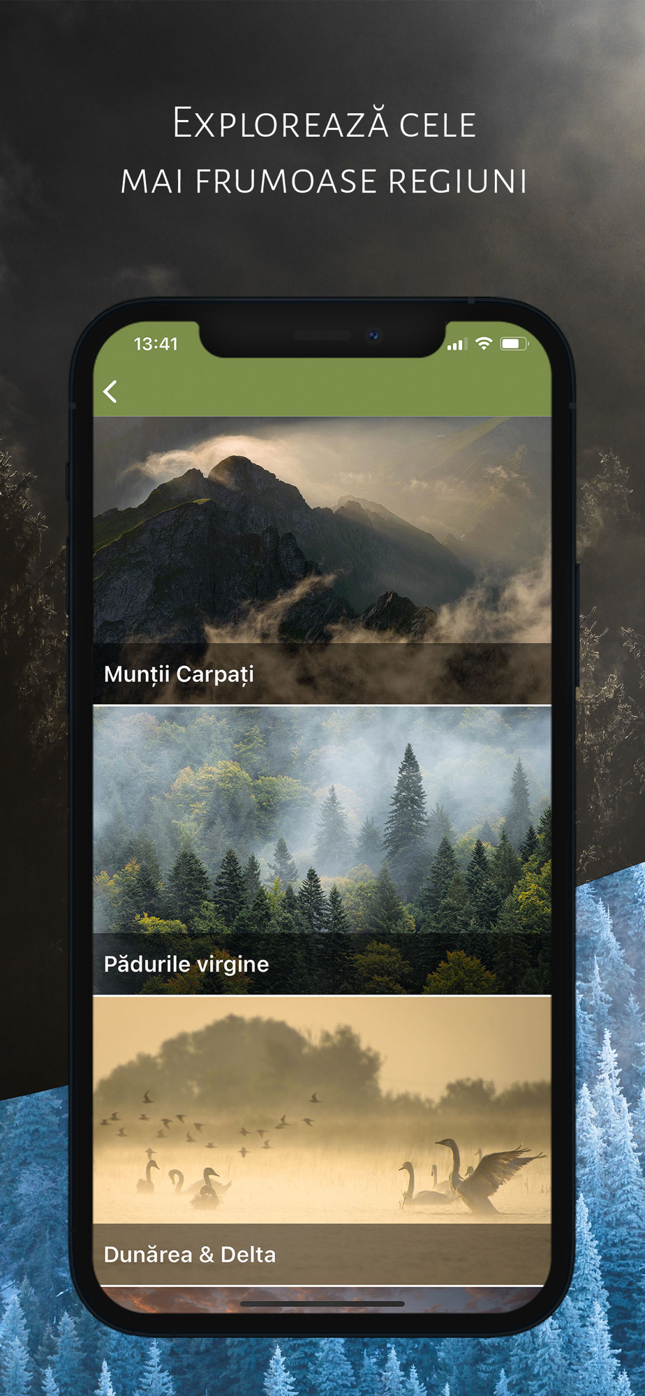 - Descoperi natura României structurată pe regiuni: Munții Carpați, pădurile virgine, Dunărea și Delta, Marea Neagră sau regiuni biogeografice;