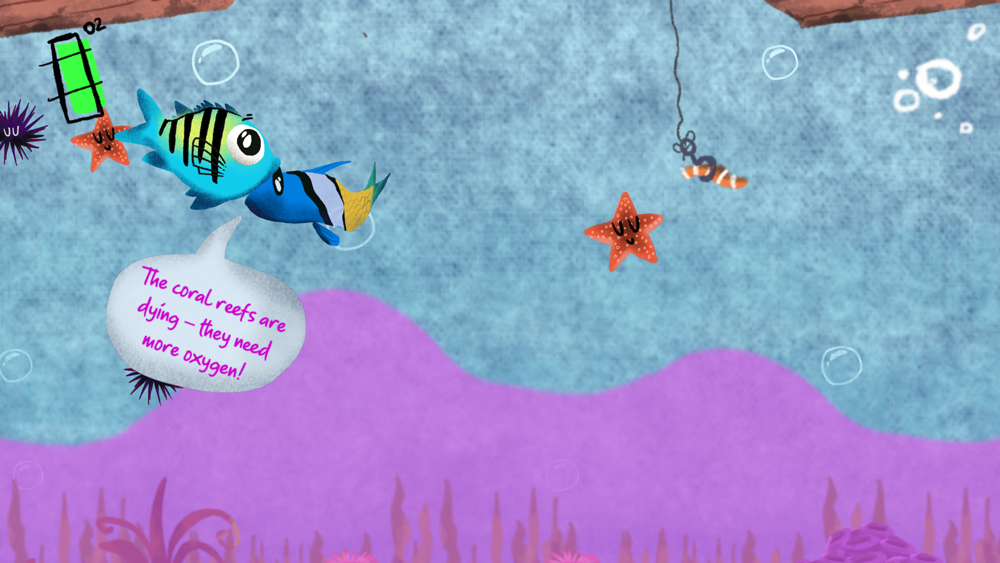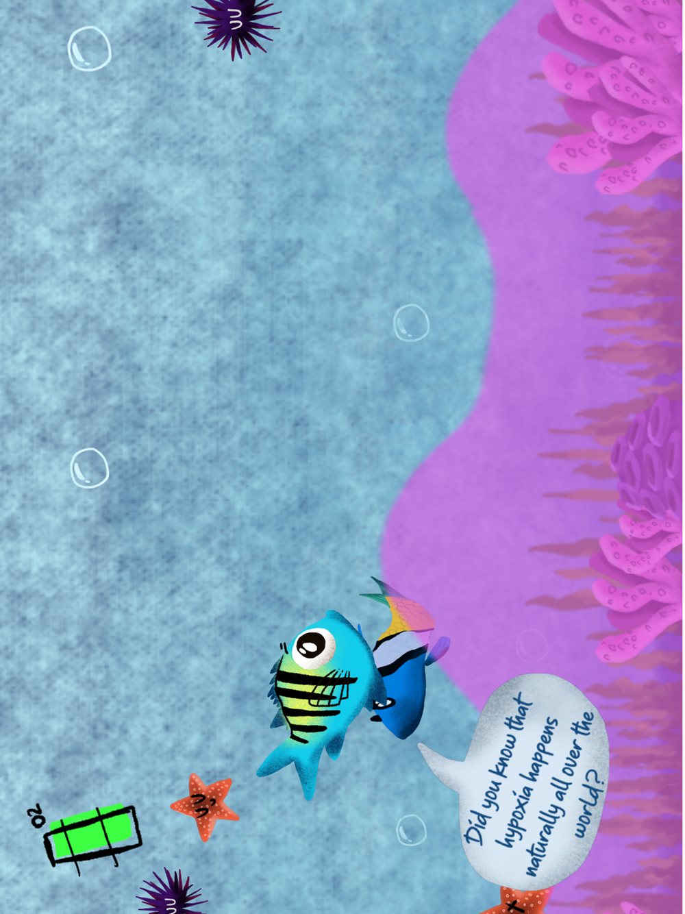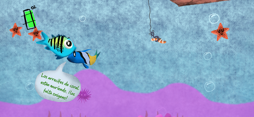 El agua marina tiene oxígeno, ¡pero puede agotarse! La hipoxia marina a menudo ocurre cuando los humanos contaminan el agua; algunos animales pueden alejarse nadando como los peces, pero los animales lentos, como los erizos de mar, no pueden moverse lo suficientemente rápido. ¡Ayuda a nuestro héroe, el sargento mayor, a escapar del agua con poco oxígeno y a salvar a sus amigos del peligro, sin ser devorado por sus depredadores!