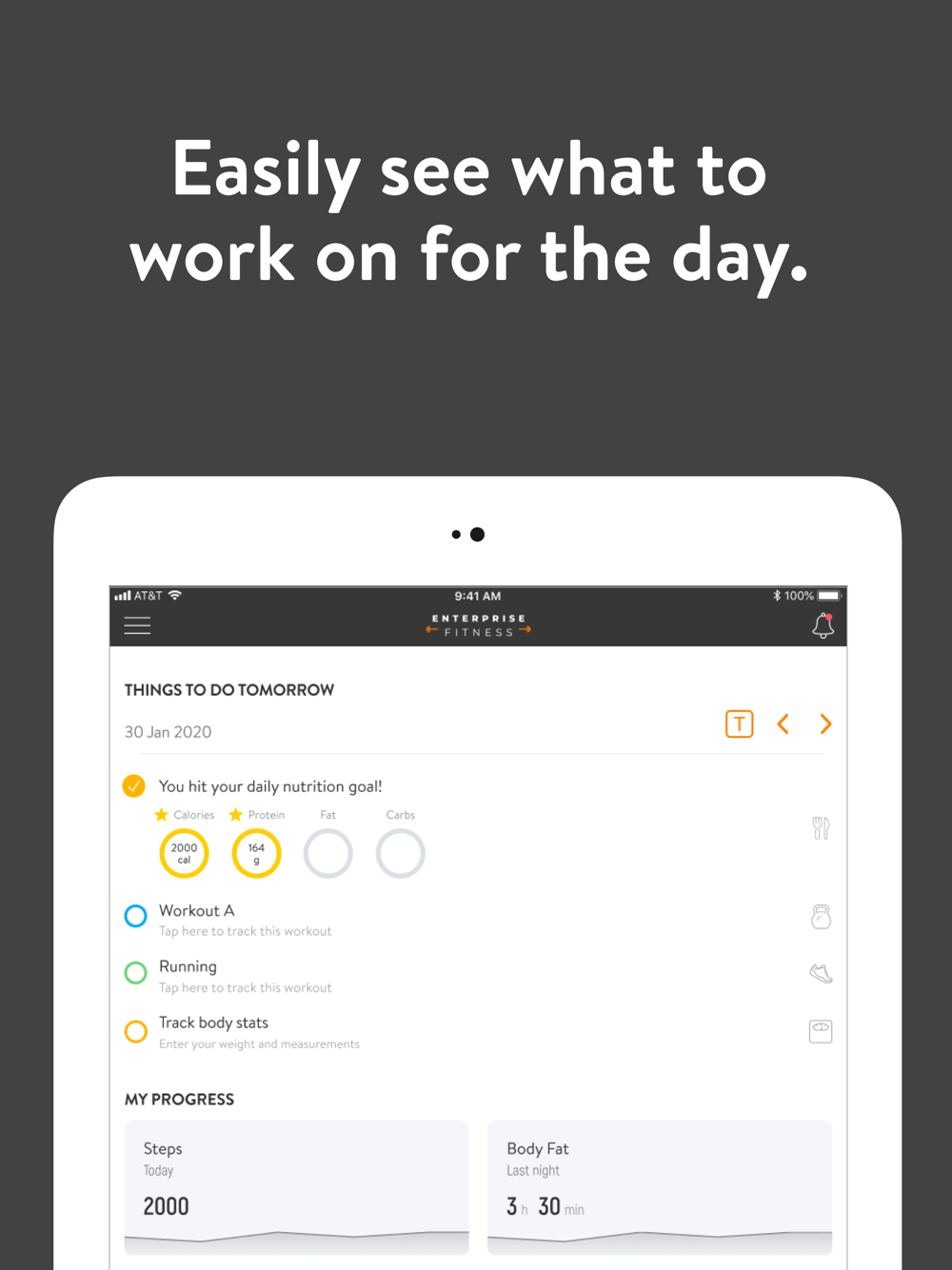 With the Enterprise Fitness App, you can start tracking your workouts and meals, measuring results, and achieving your fitness goals, all with the help of your personal trainer.