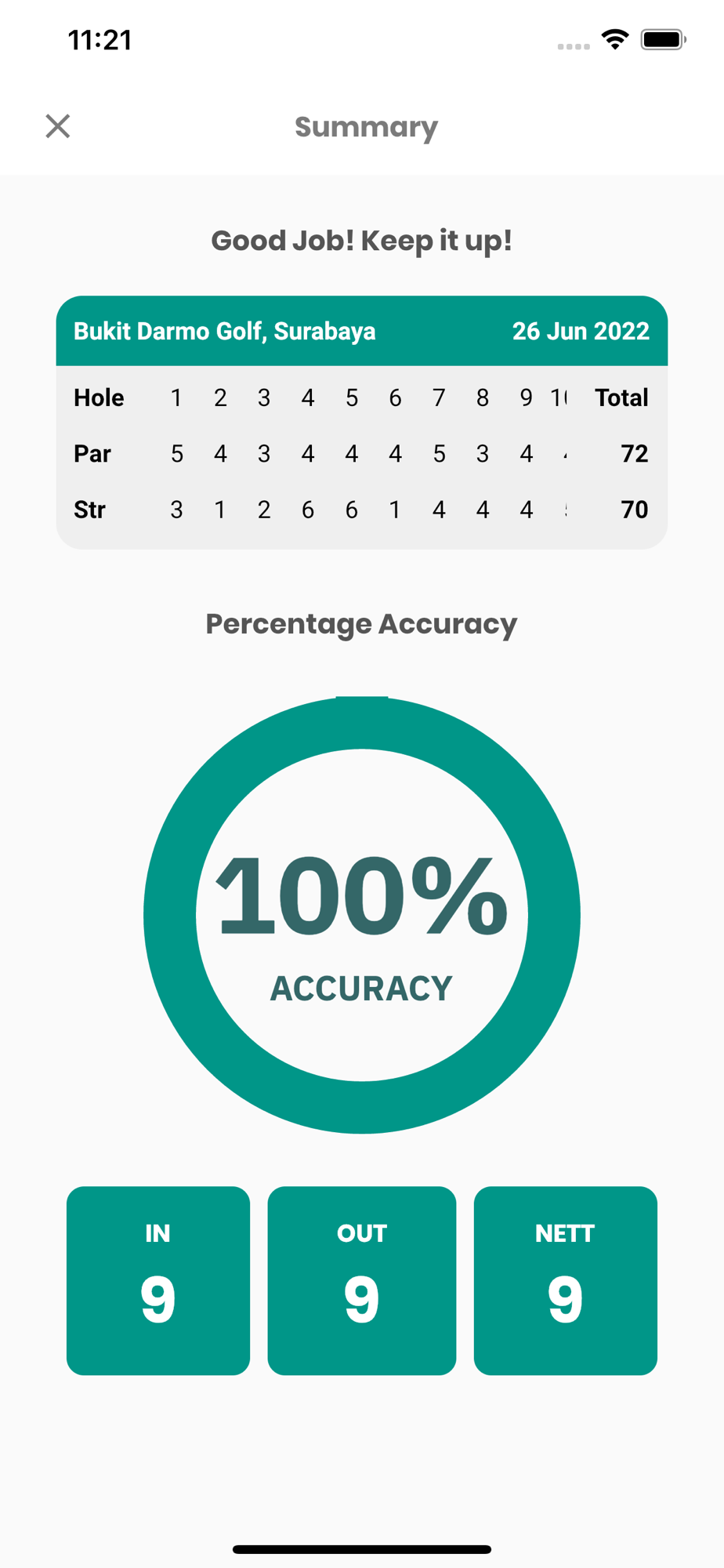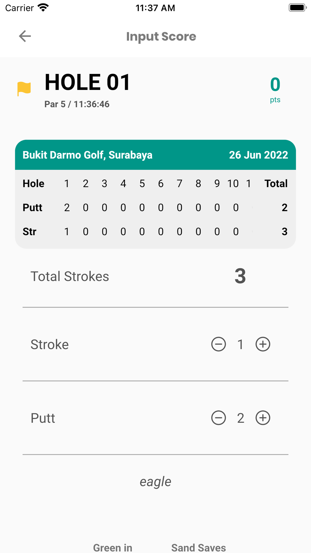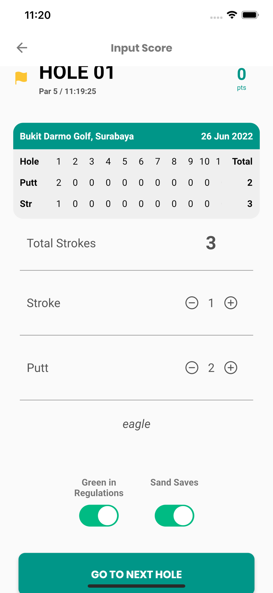 - Record strokes, puts, and penalties, with greens in regulation and sand saves. Input the score and shot details per hole.