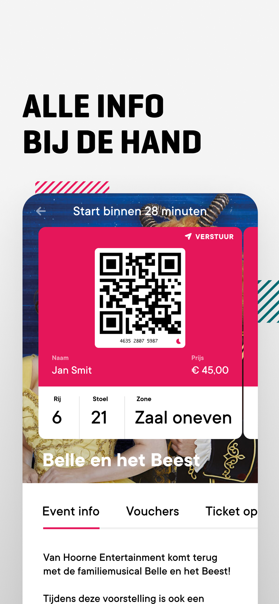 Al je tickets zijn automatisch beschikbaar in de app, zelfs als je offline bent. Je hoeft geen tickets meer te printen, toon eenvoudigweg je telefoon aan de ingang!