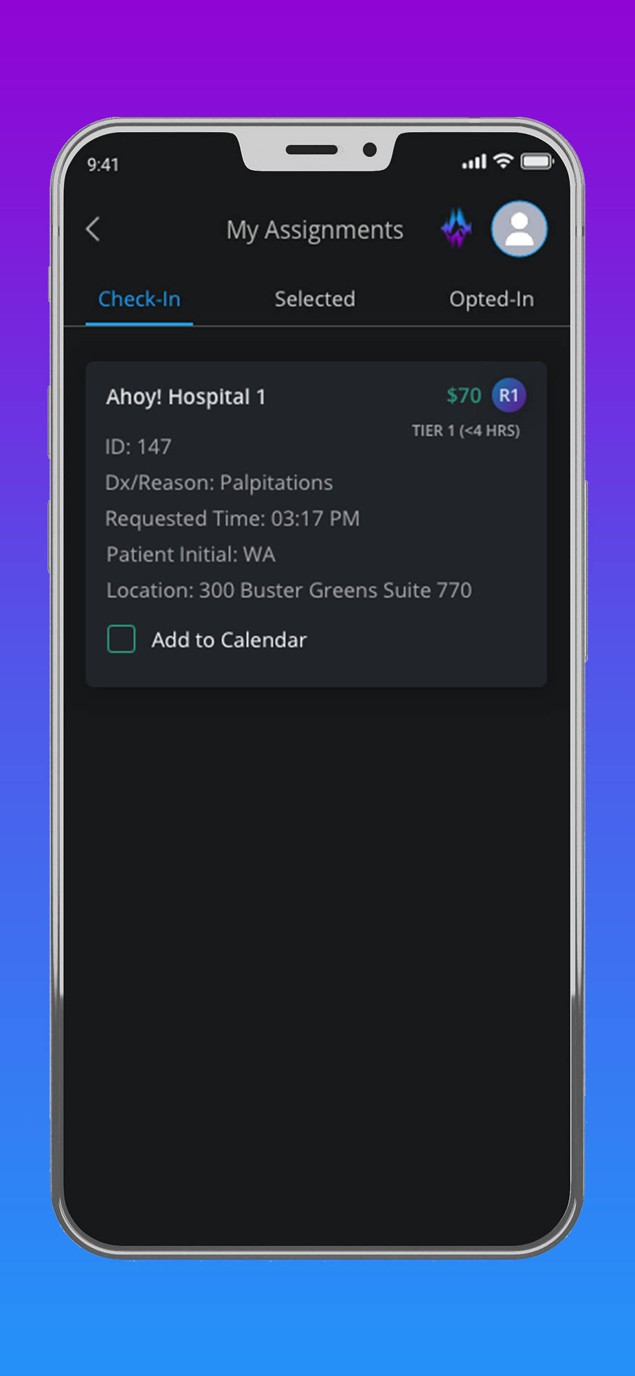 - View assignments in real time as they are needed by the hospital or requesting physician