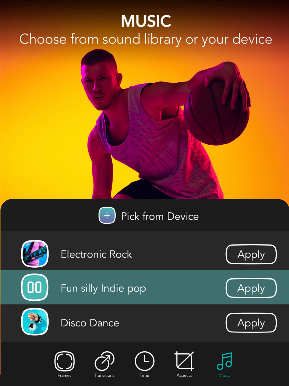 To add music to your video slideshow, simply choose the right song from our music gallery or upload from your device. Adjust the music volume to fade in/out.