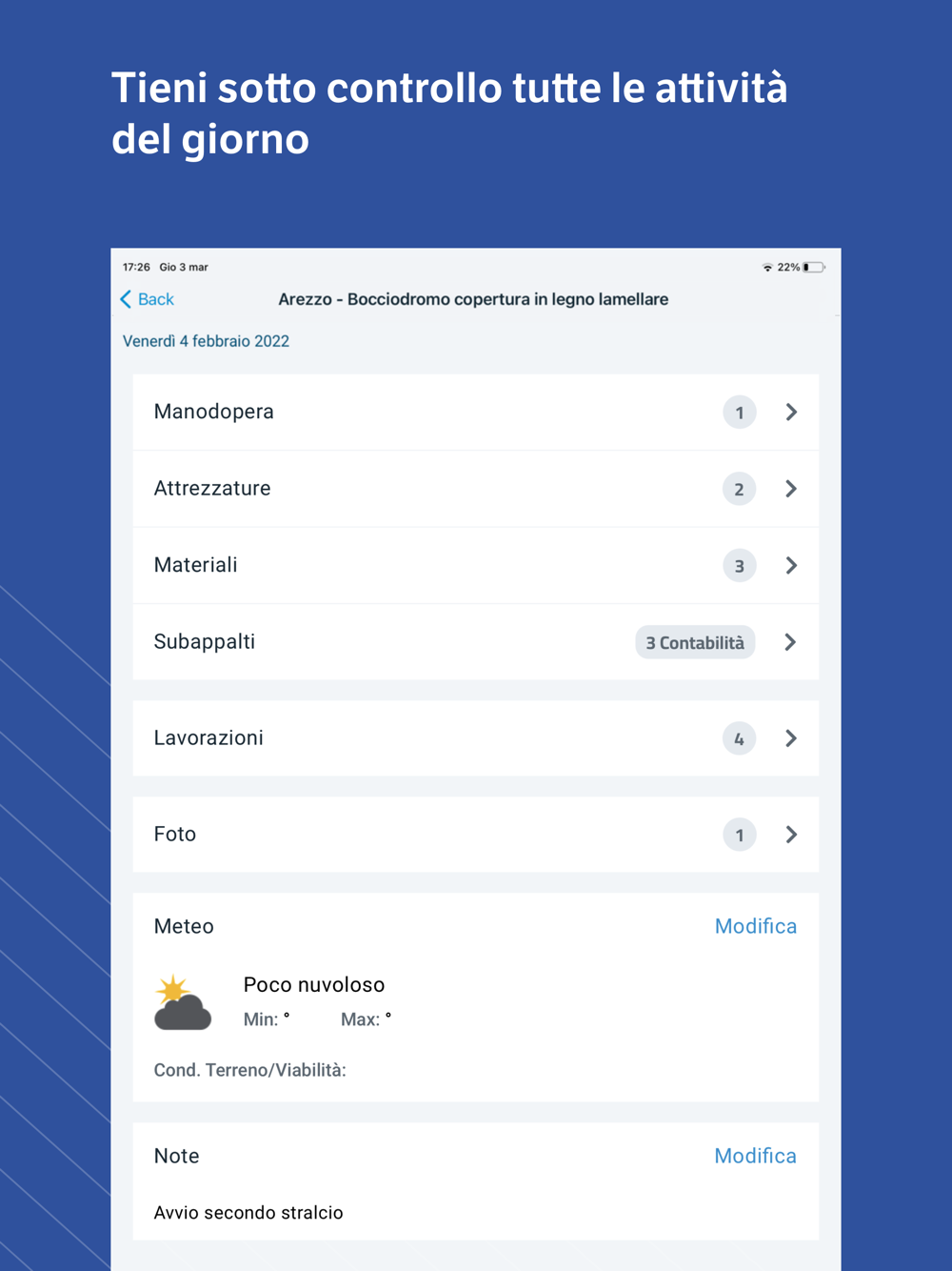Scatta foto, inserisci le ore di manodopera e attrezzature, annota le misurazioni sia nel libretto della contabilità attiva che nei libretti di subappalto, rileva l’avanzamento dei lavori e il materiale consegnato, per ogni giornata dei tuoi cantieri.