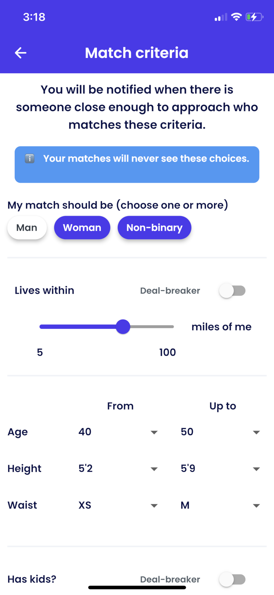 Find people who are compatible and open to meeting you in person in any public setting. No swiping, no texting, no phone/video calls. Set up your profile and match criteria once, then put your phone away and go live your life. You'll be notified whenever a compatible match is nearby, and you'll get to exchange photos and interests before revealing your precise location. Once you do, you'll get to meet your match instantly, for as short or long as you both want.