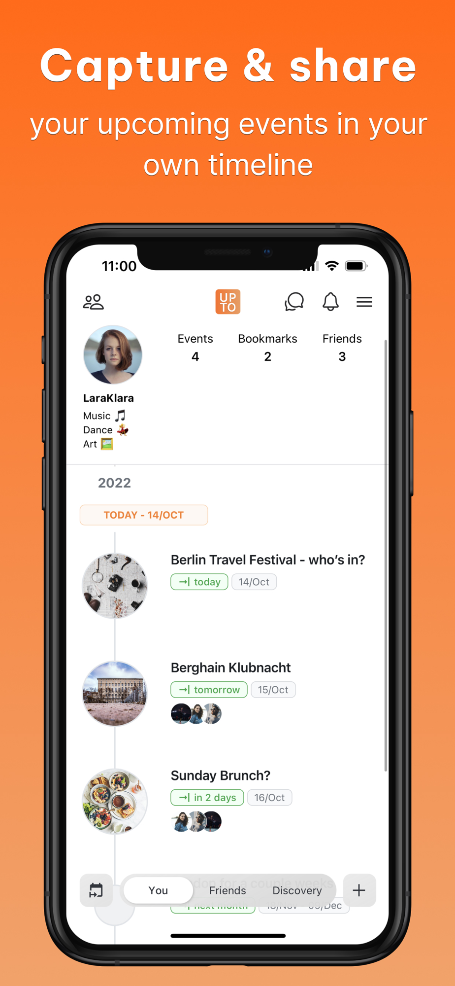 Upto is a very young app. We aim to become the one-stop solution to discover, talk about and organize events for you and your friends. We look forward to your feedback to make that vision a reality!