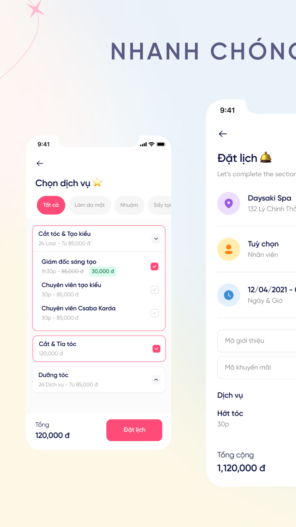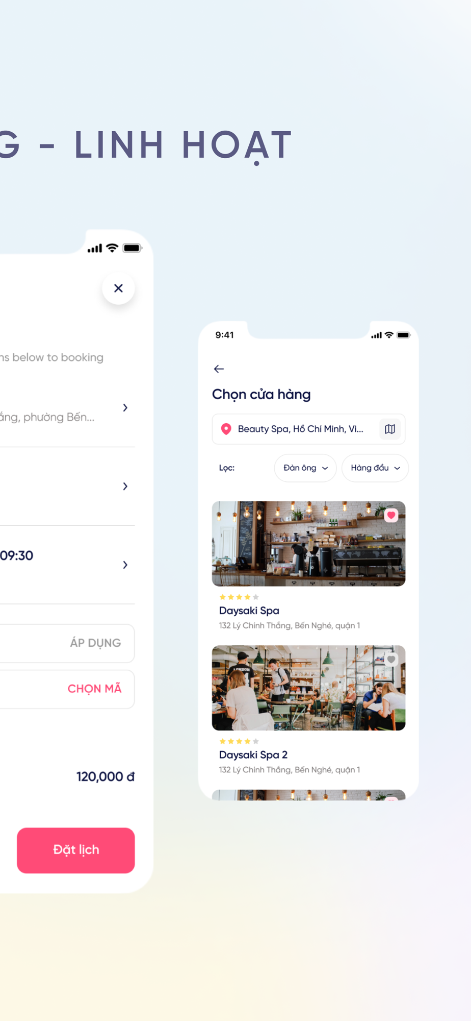 Tính năng đặt lịch trực tuyến cho phép bạn đặt lịch hẹn bất cứ lúc nào, sử dụng bất kỳ thiết bị nào. Chỉ với vài thao tác đơn giản trên điện thoại, thông tin của bạn sẽ được gửi đến chi nhánh Spa gần nhất và xác nhận với bạn qua điện thoại.