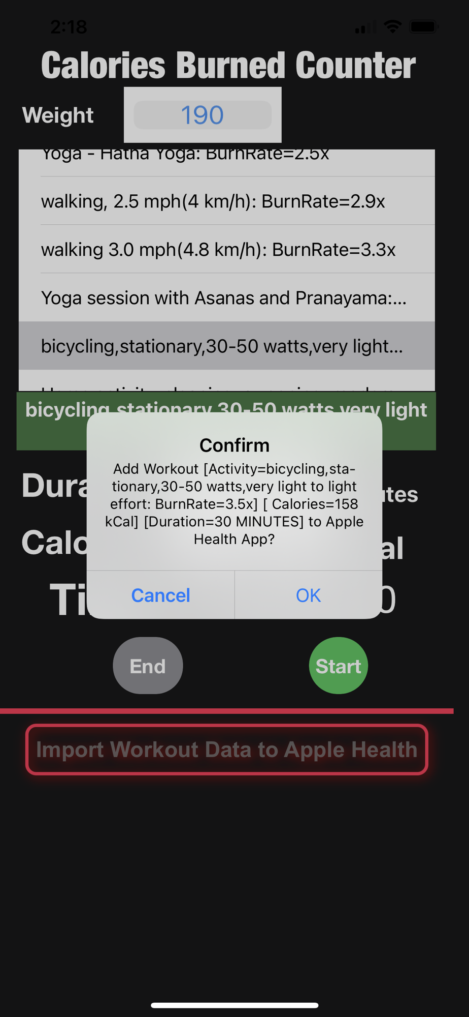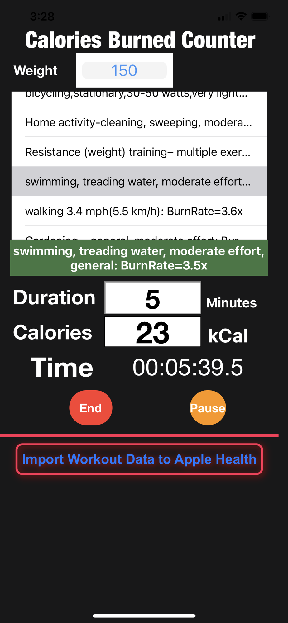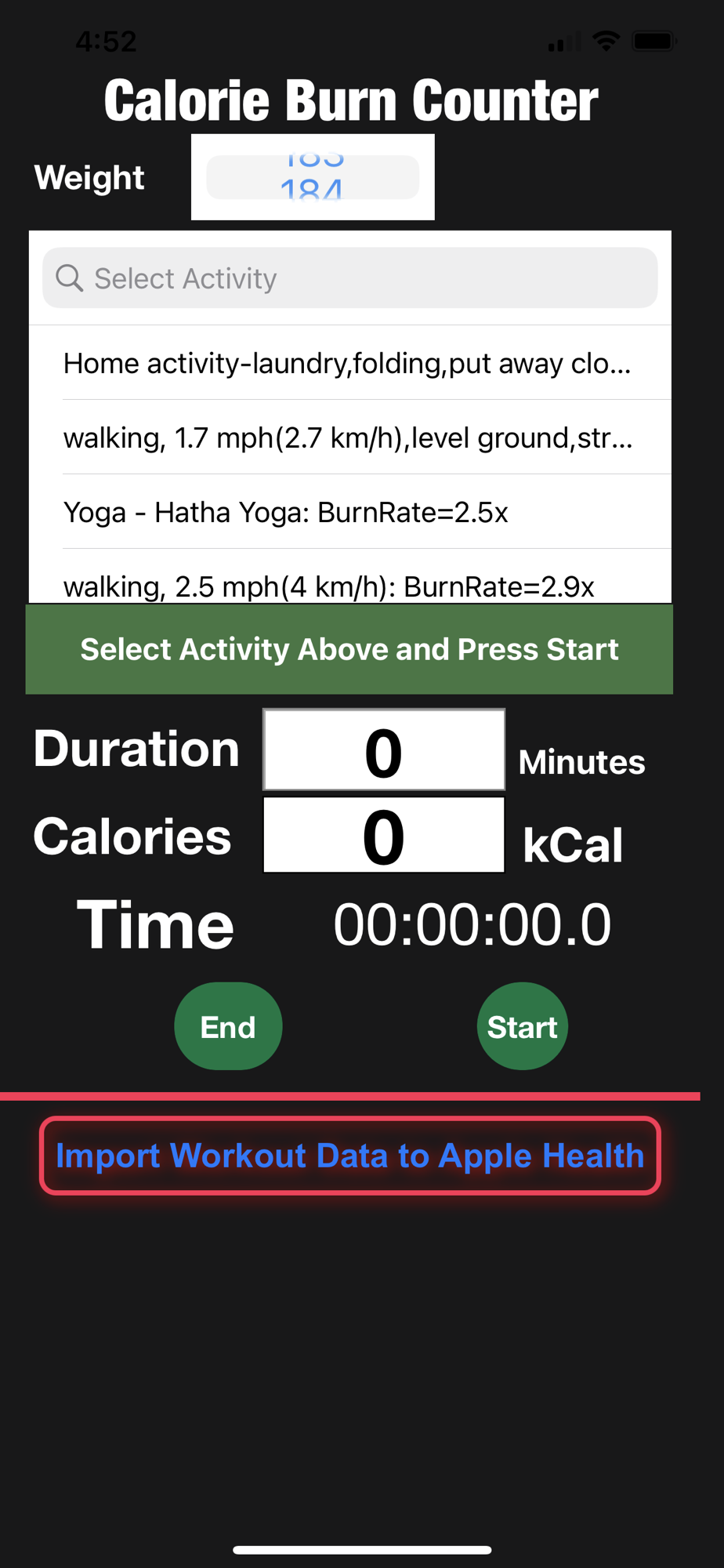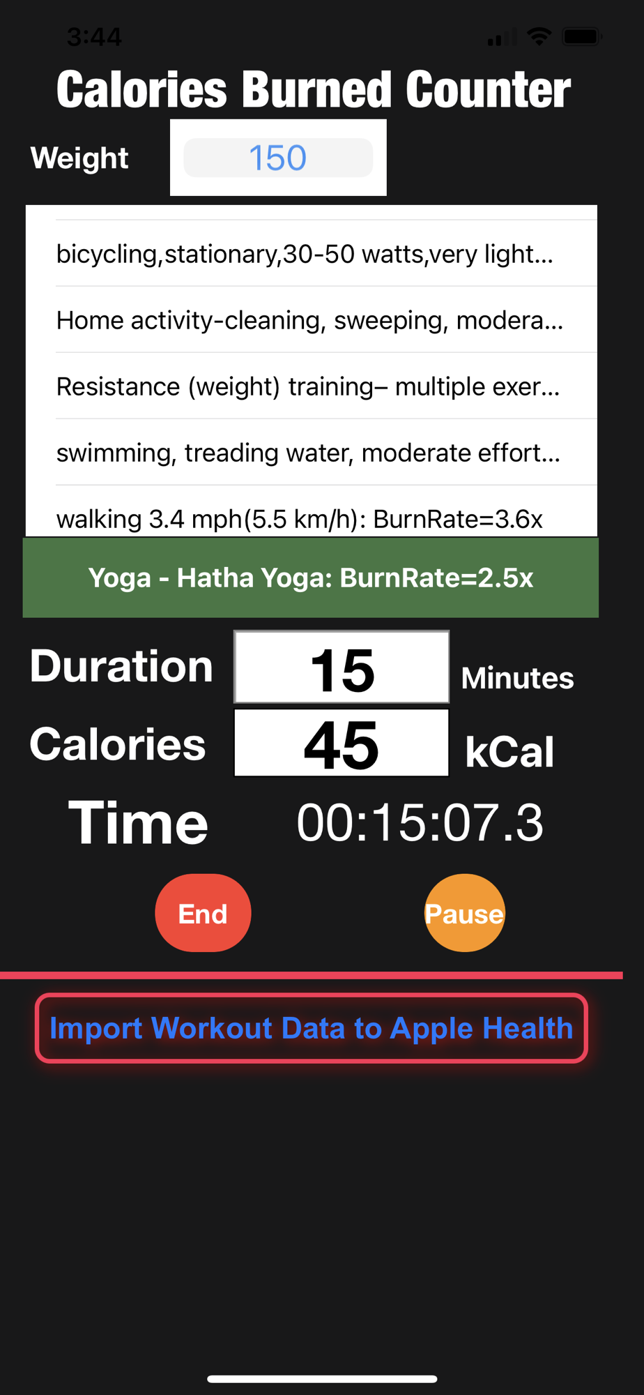 Are you at the gym and you want to track your Workout as u are Exercising? No problem. Just pull out your CalorieTicker App - Select Activity and Click Start. The app tracks your CALORIES BURNT PER SECOND in real time customized by knowing just your body weight. U can pause the app as u stop or resume your workout. When u complete your workout just press the END button. U can then choose to save your workout duration and calories burnt AS IS or u can update the duration and calories burnt just like u do when u save your workout data after exercising. This App helps u track your calorie burn in real time and makes sure u don't forget to log your workout data by providing a "One-Click IMPORT" save feature to Apple Health. Your Workouts and "Active Energy" i.e. calories burnt while exercising are saved in Apple Health App.
