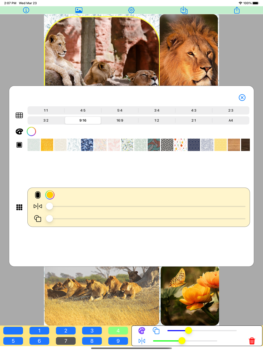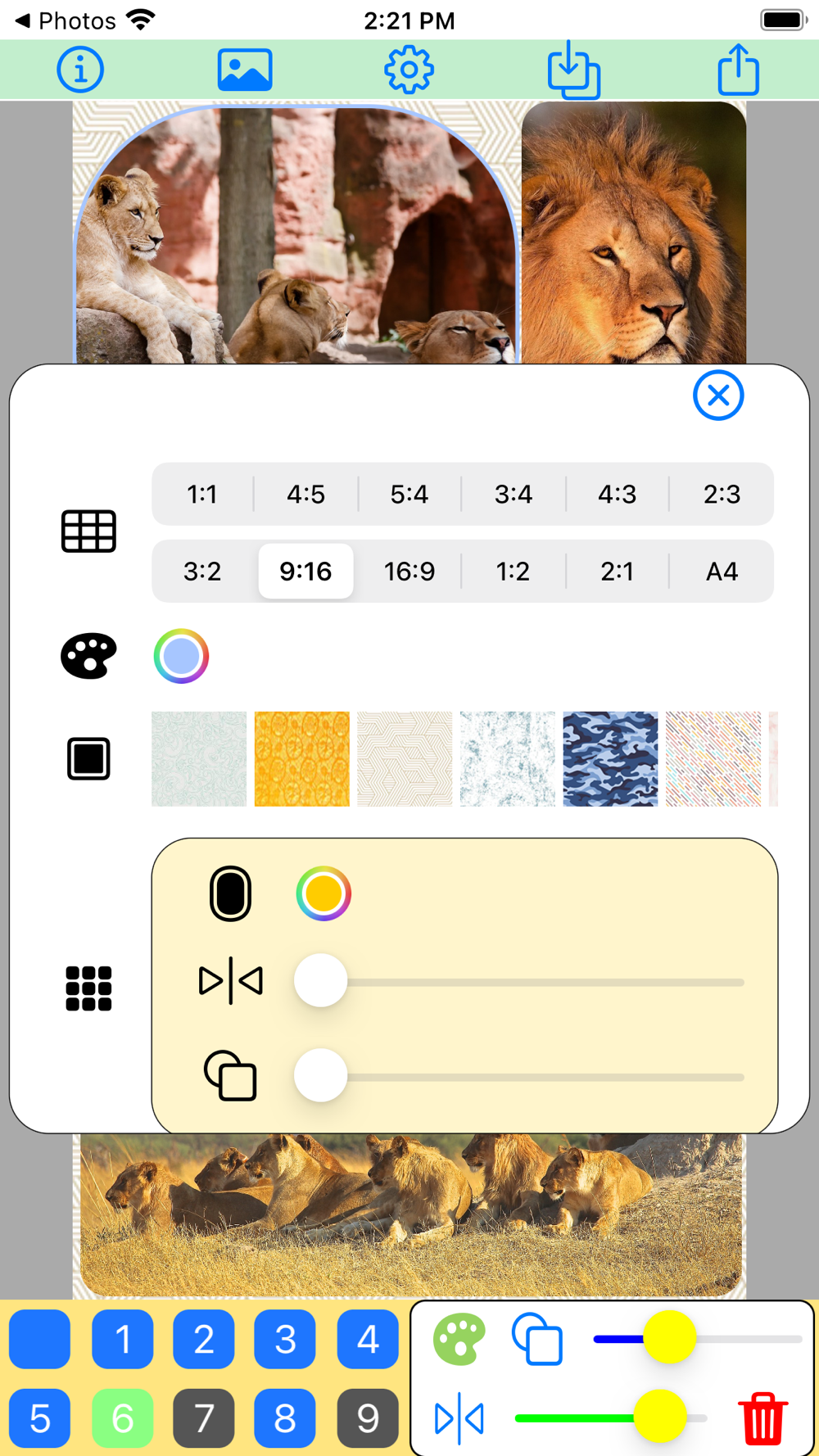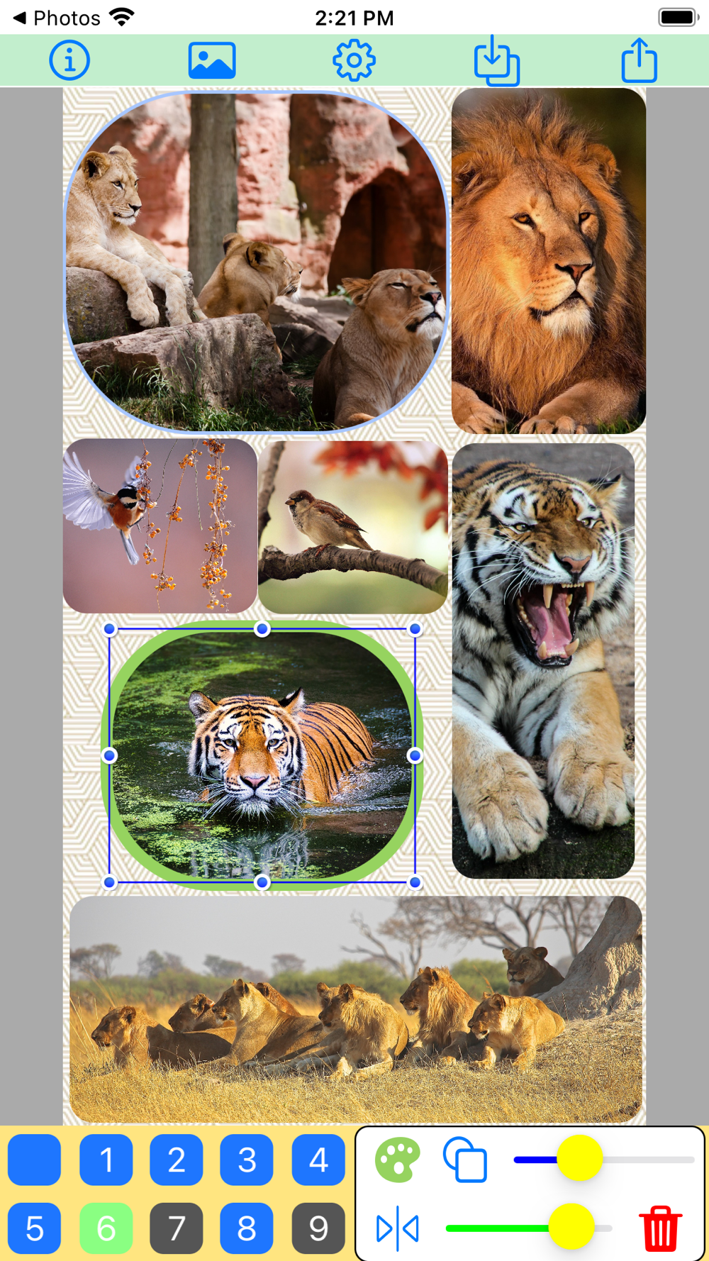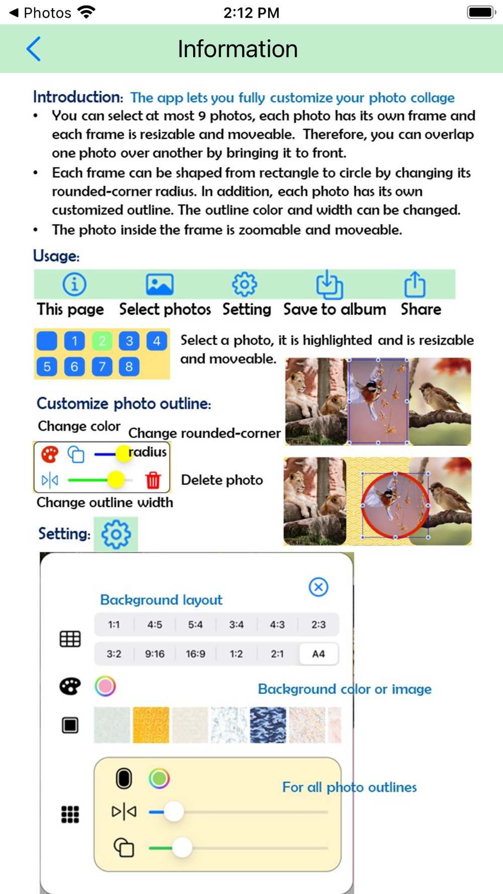 1. You can select at most 9 photos, each photo has its own frame and each frame is resizable and moveable.