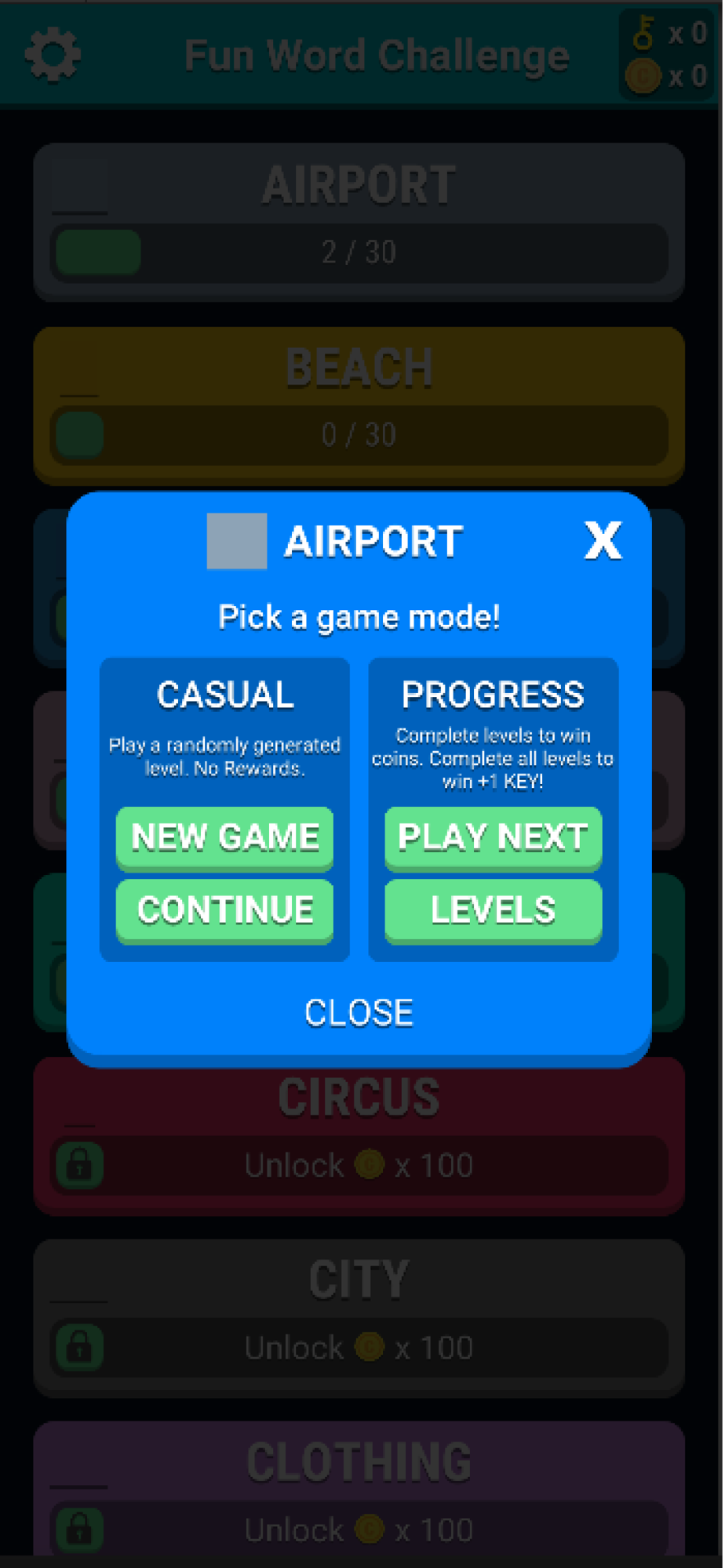 You can select up to 38 different categories. Each topic has 30 levels each, as well as an option of customised levels depending on which difficulty you select. Completing all 30 levels in a category will give you a key. Keys are needed to unlock some topics. You also obtain coins after the completion of a level. Coins are used to unlock other categories or can be used to help you complete levels.