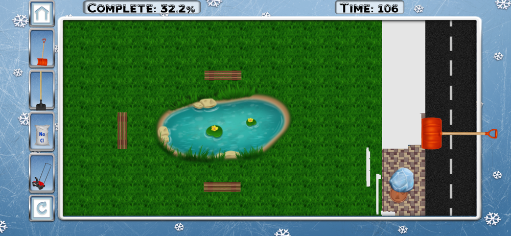 The goal is to clear as much snow and ice off of the sidewalks as fast as you can. While clearing the snow, the player will find pennies, quarters, loonies and other coins buried under the snow and ice. The player can use these coins to unlock a variety of items to help them clear the sidewalks such as: shovels, ice picks, ice salts, snow blower and even a flamethrower. All of these items will help the player clear driveways, parks and sidewalks after a snowstorm.
