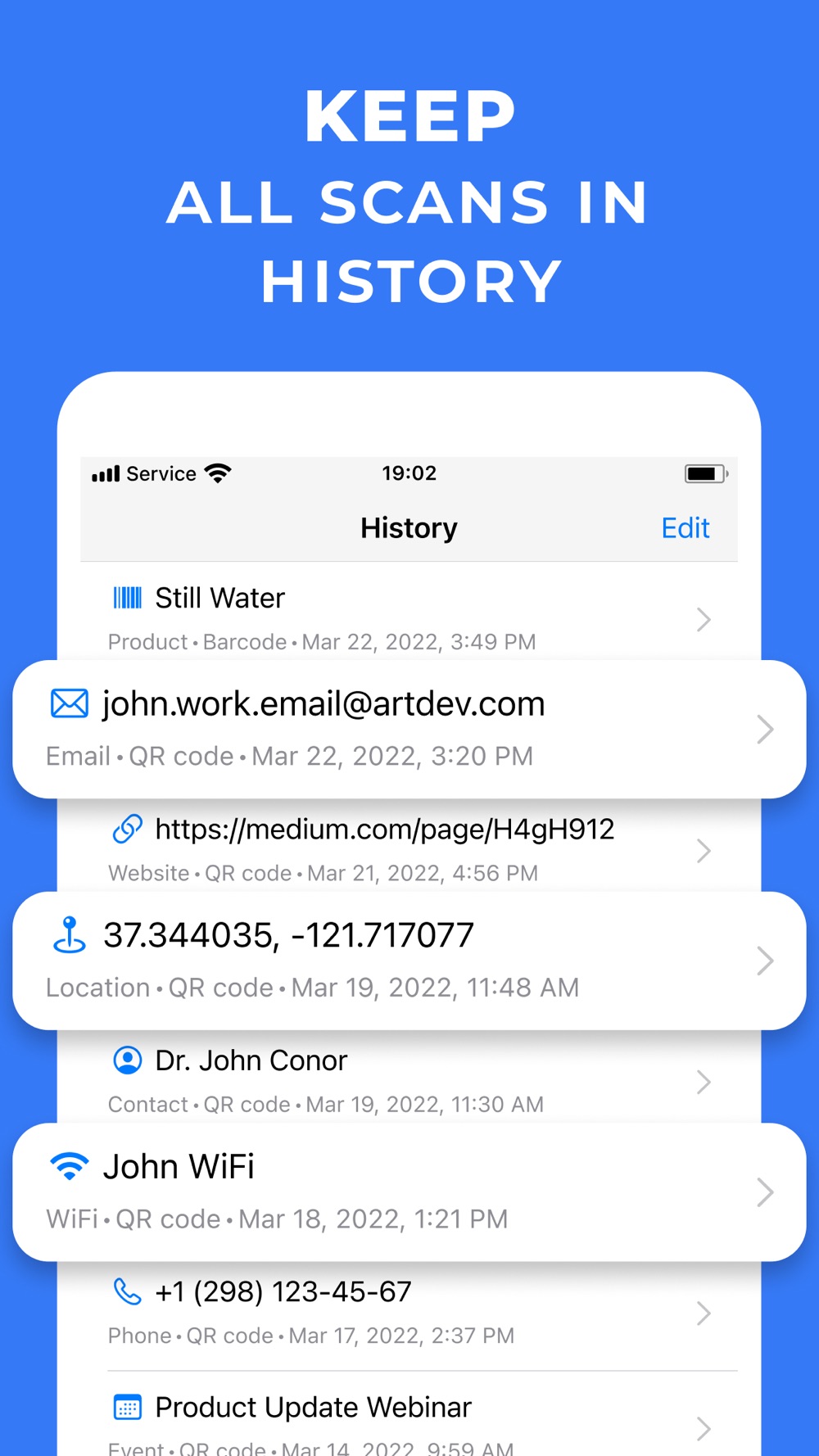 Quickly scan and get any kind of information needed. Follow links, save to contacts, look up places on the map or search for prices online, etc. Do whatever you need to do with the scanned data.