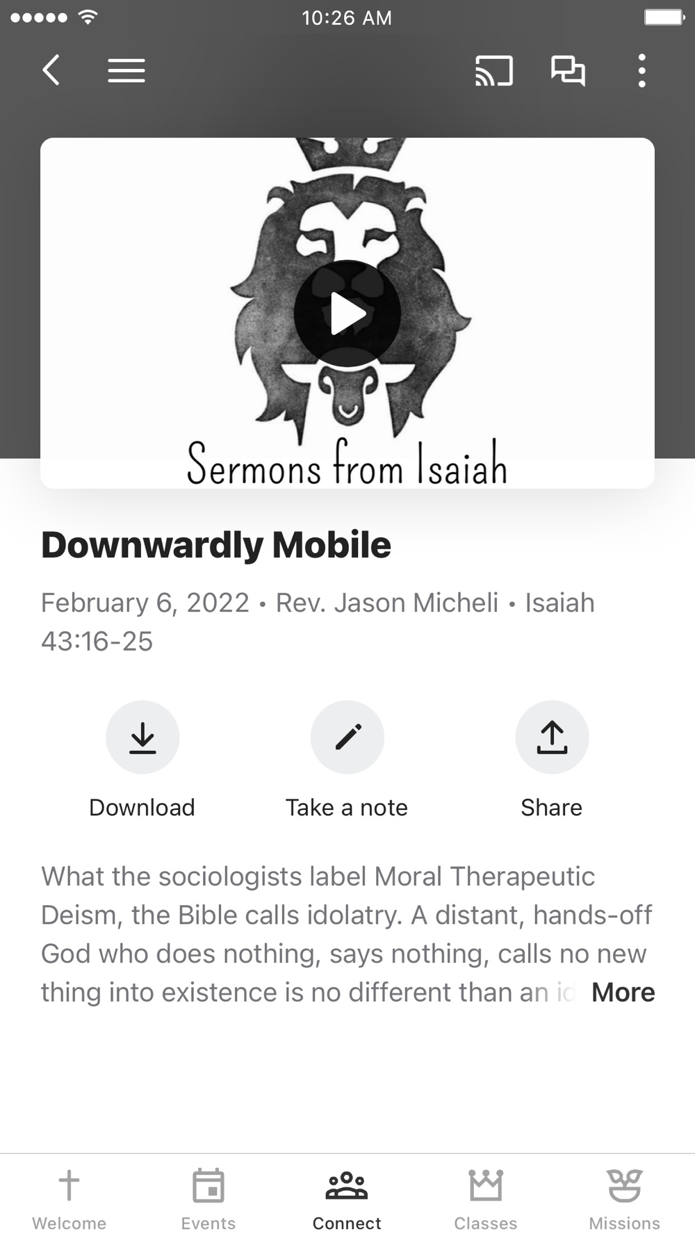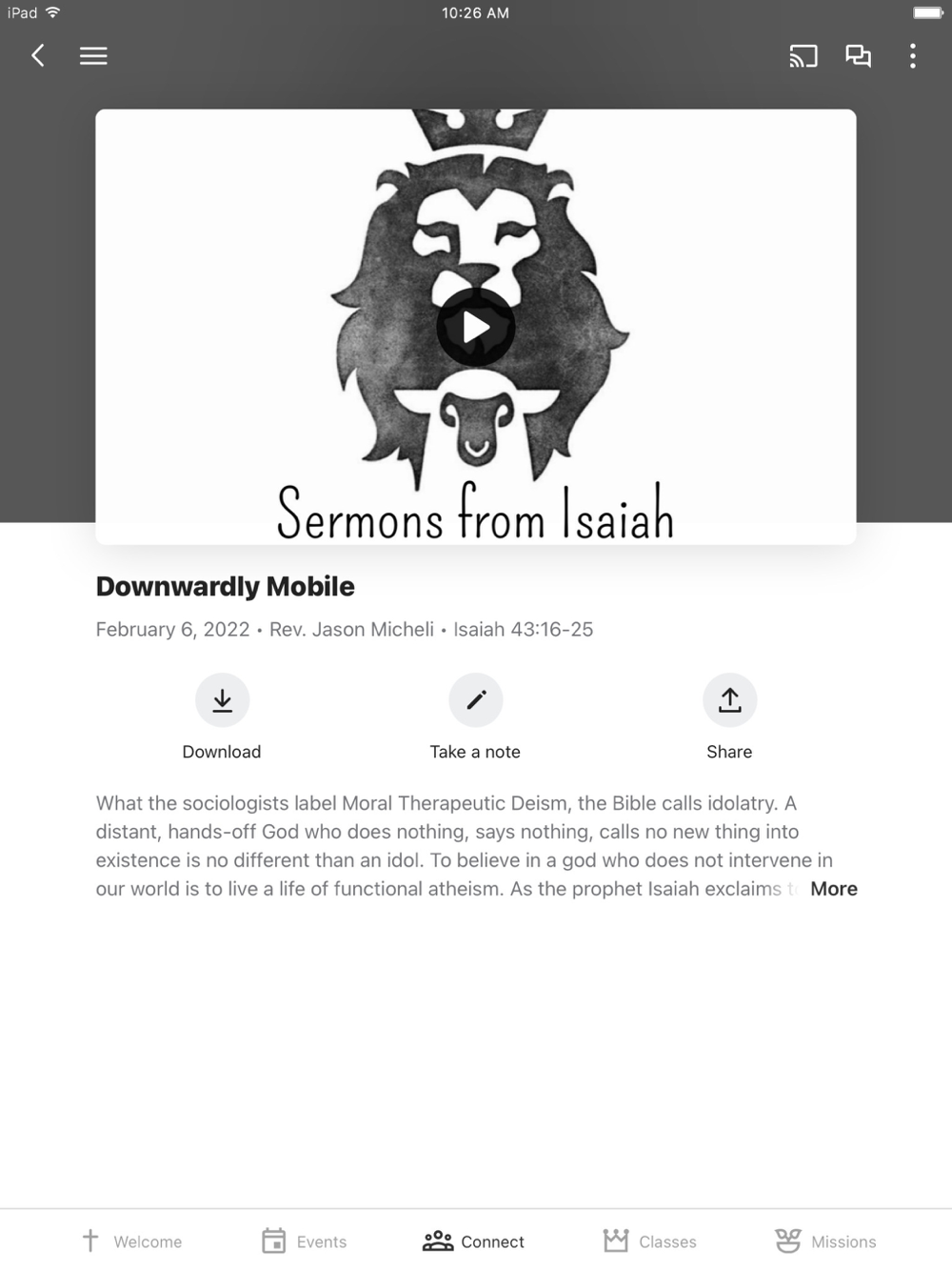 This app will help you stay connected with the day-to-day life of our church. With this app you can: watch or listen to past messages; stay up to date with push notifications; share your favorite messages via Twitter, Facebook, or email; and download messages for offline listening.