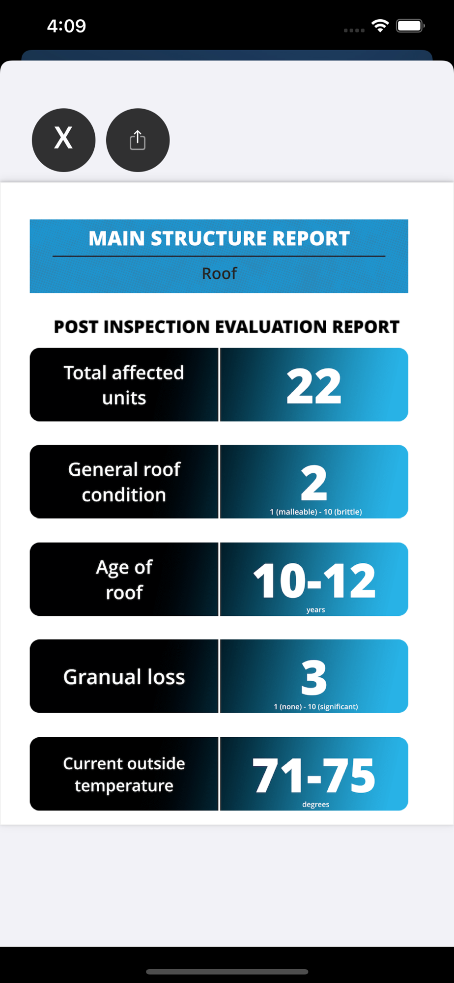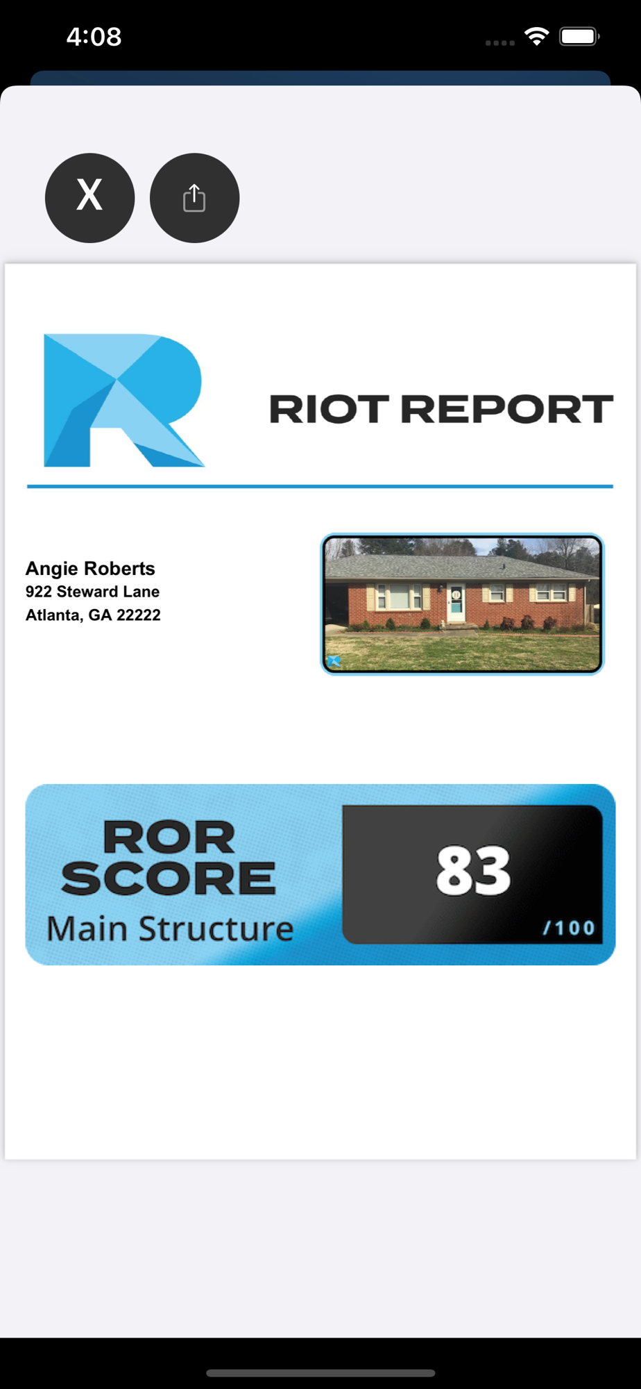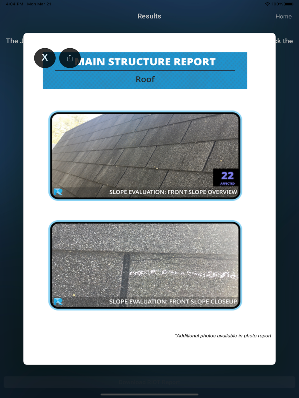 The RIOT Inspections app makes claims inspections simple. Through a top to bottom photo guided inspection process, and basic data point entry, a seamless, uniform report, as well as a “repair or replace” coverage grade, is produced with little to no field adjusting experience. The coverage grade, or "ROR Score" was developed Based on a survey of over 100 adjusters at over 20 different insurance carriers. This survey required these adjusters to rank our evaluation data points in order of the degree of importance to determine the final coverage decision that was reached.
