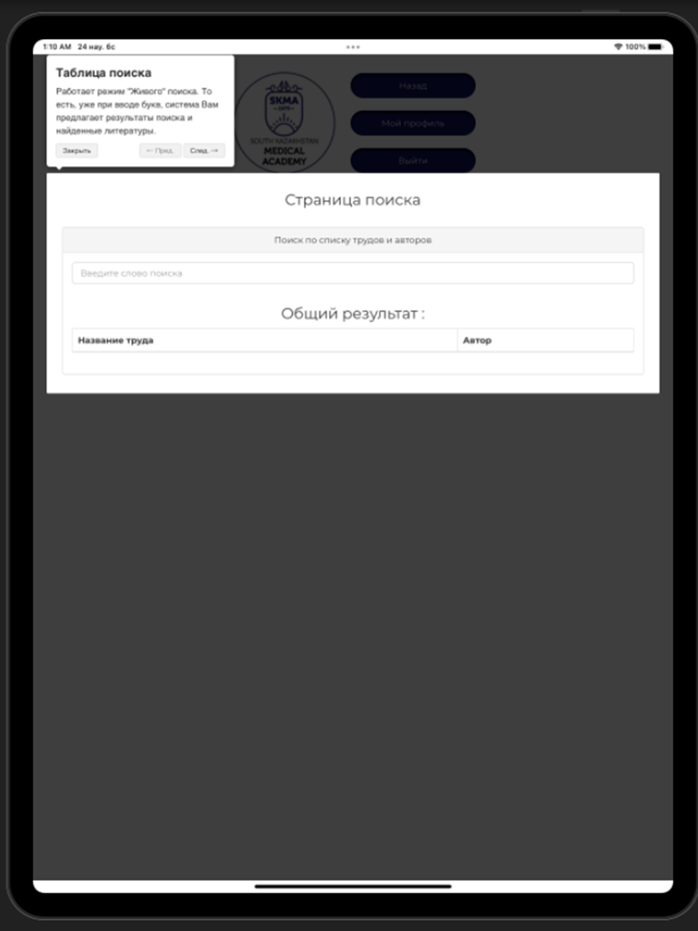 Данный продукт является приложением для студентов и сотрудников Южно-Казахстанской Медицинской Академии. С помощью данного приложения Вы сможете получить доступ к 100 учебно-методическим литературам в базе данных библиотеки. База данных будет периодически дополняться новыми литературами.