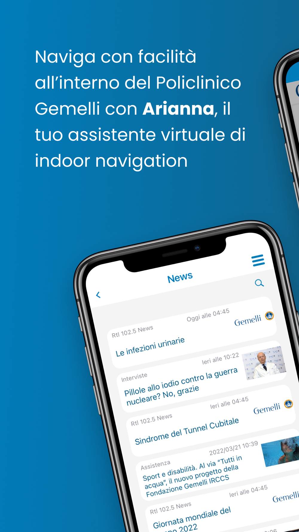 Arianna è il servizio di navigazione all'interno del Policlinico Gemelli che indica il percorso migliore per raggiungere la destinazione selezionata e descrive tutti i servizi che l'ospedale mette a disposizione dei propri assistiti.