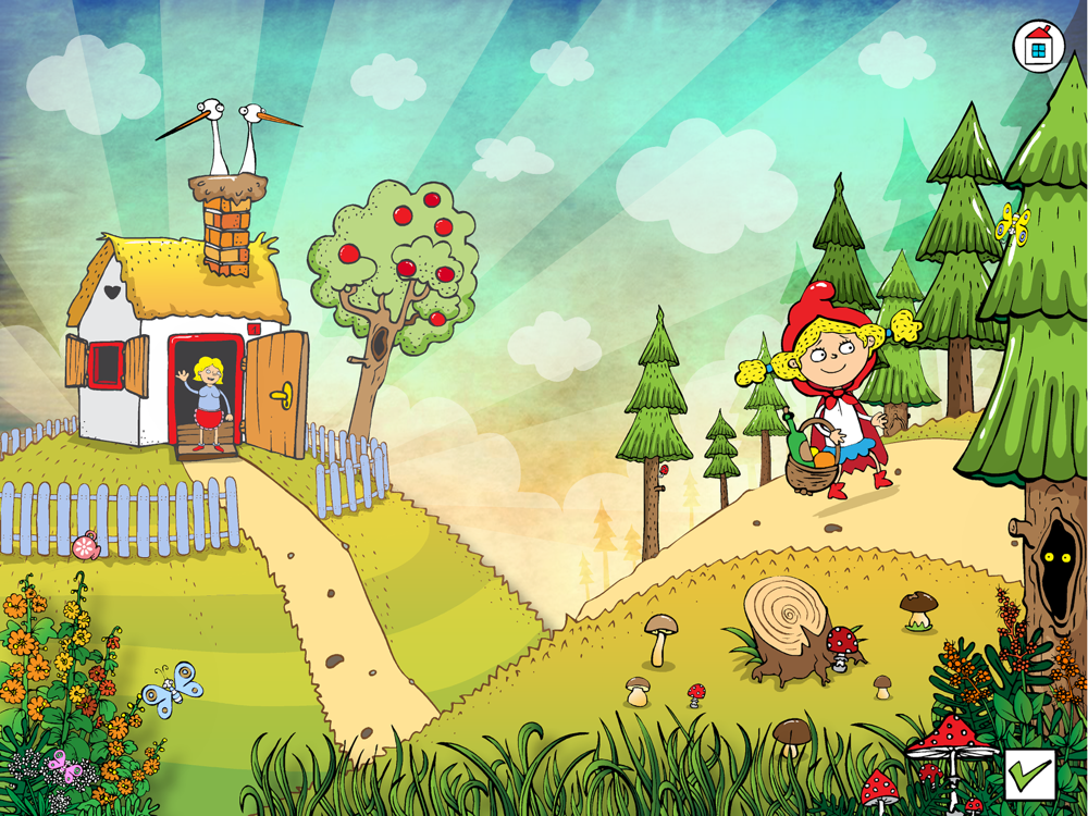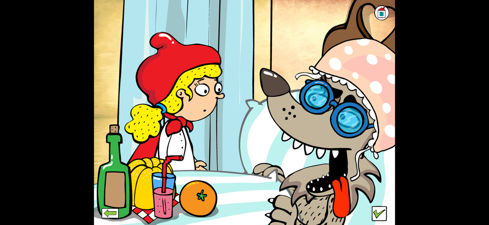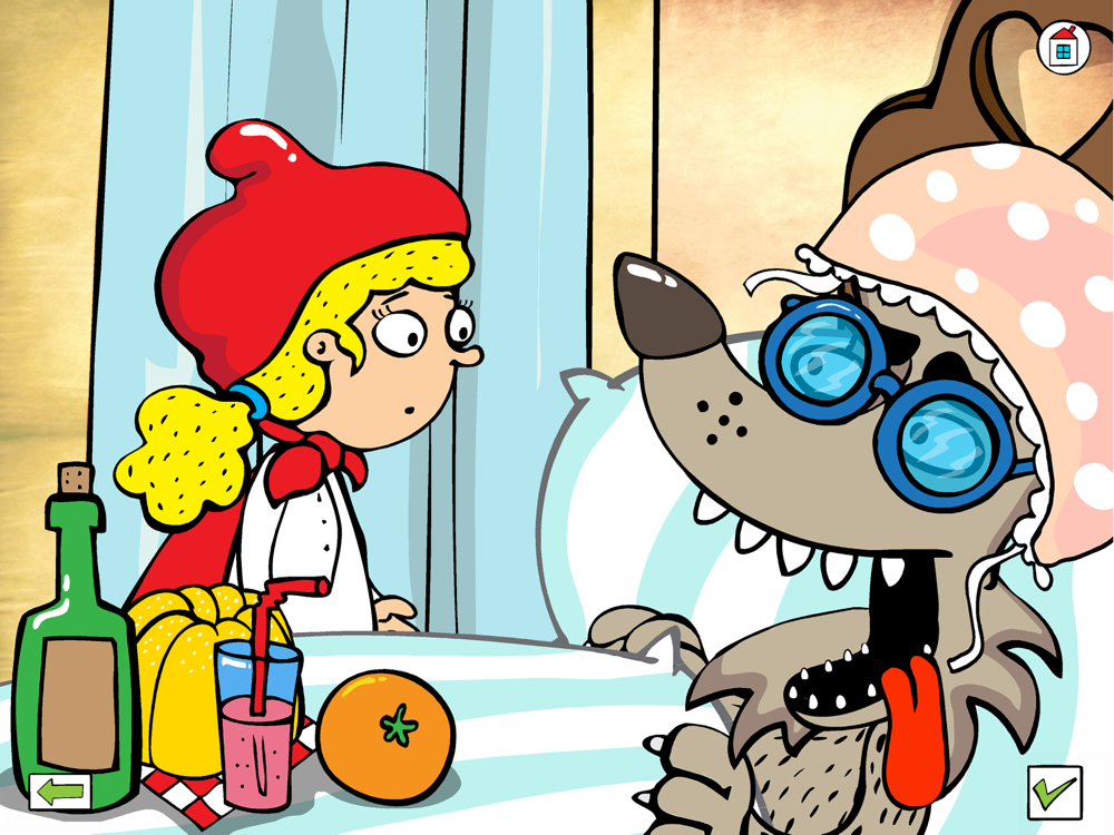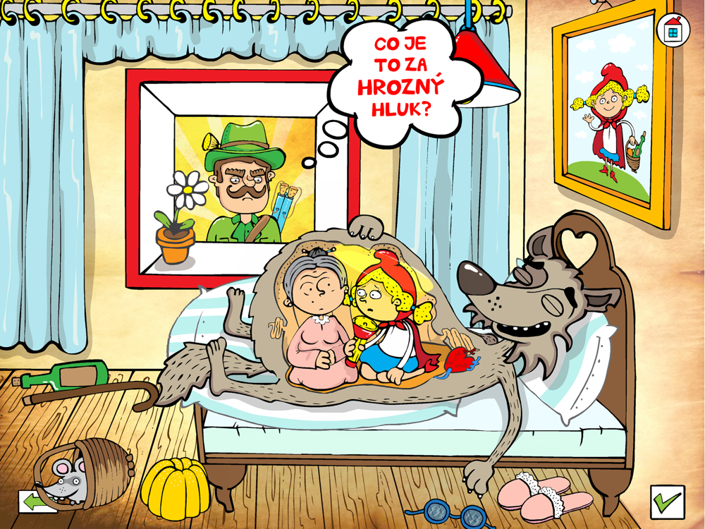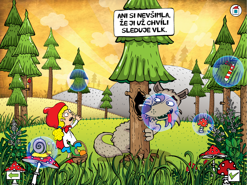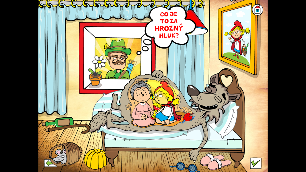Můžete se rozhodnout, jestli bude číst vypravěč, zatímco děti budou prozkoumávat prostředí lesa a babiččiny světničky, nebo zda k interaktivní knížce s dětmi usednete společně. Příběhem vás provede text v komiksových bublinách uspořádaných tak, aby zbylo co nejvíce místa pro zvídavé dětské prsty a barvitou představivost. Všechny předměty ve scéně jsou krásně animované a ozvučené.