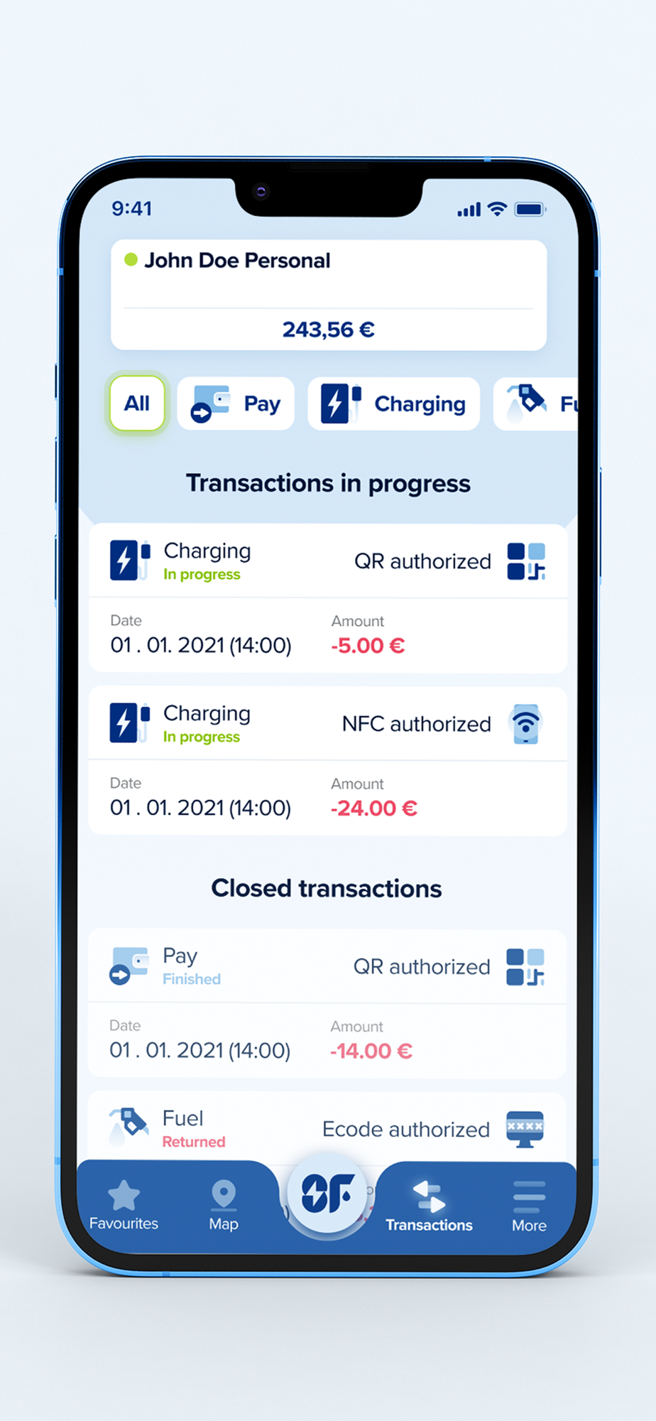 Follow the charging process directly in the application. A perfect overview of charging with information on the current charging power, battery state of charge in percentage or delivered energy. Including history of all your transactions with price, length or location of charging.