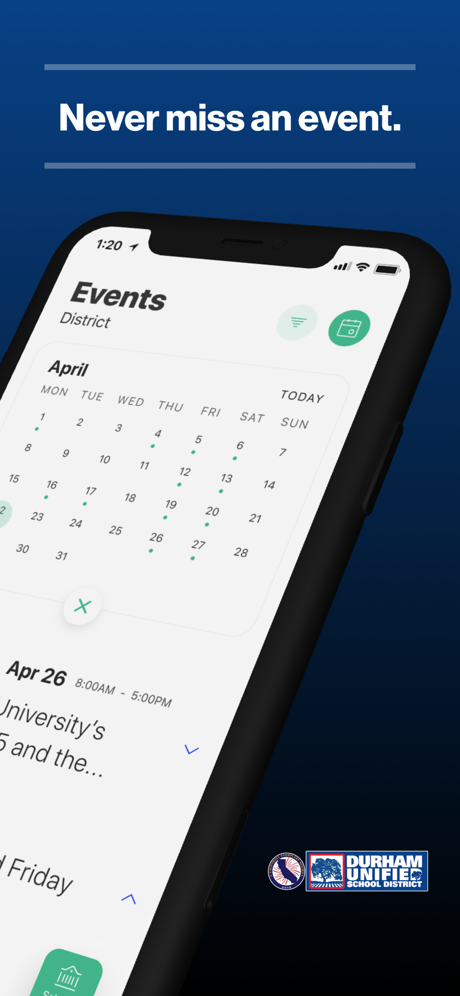 The event section shows a list of events throughout the district. Users can add an event to your calendar to share the event with friends and family with one tap.