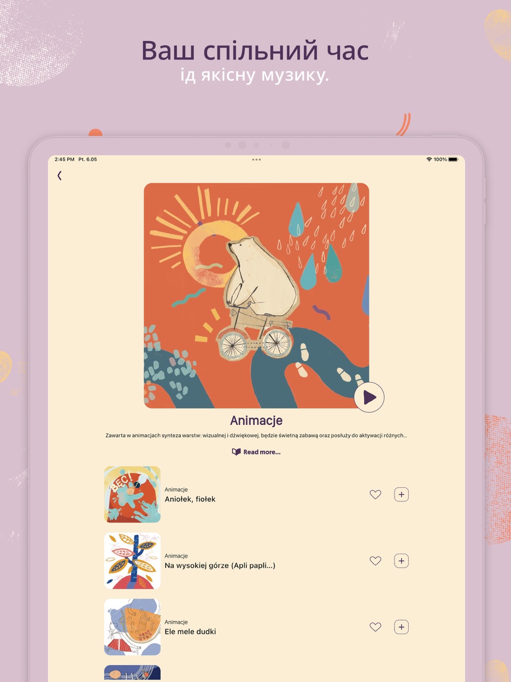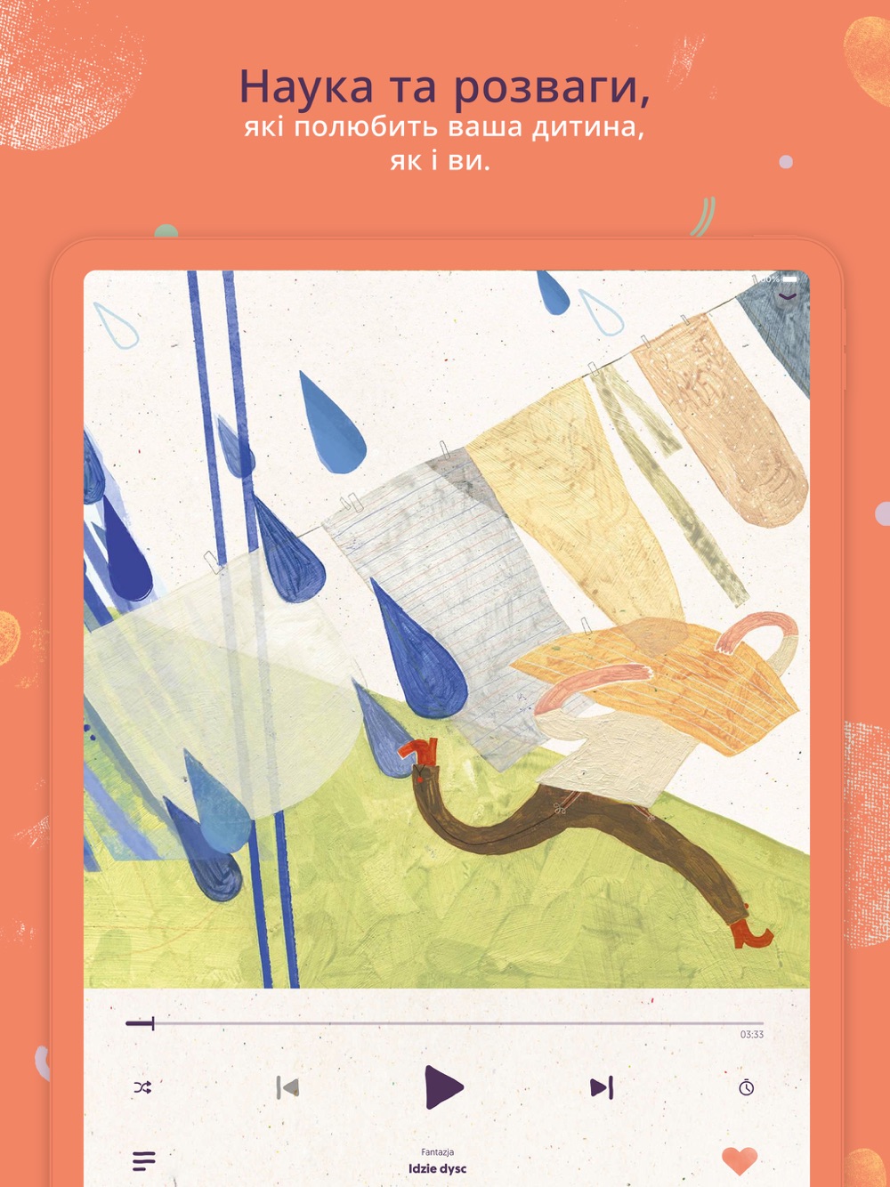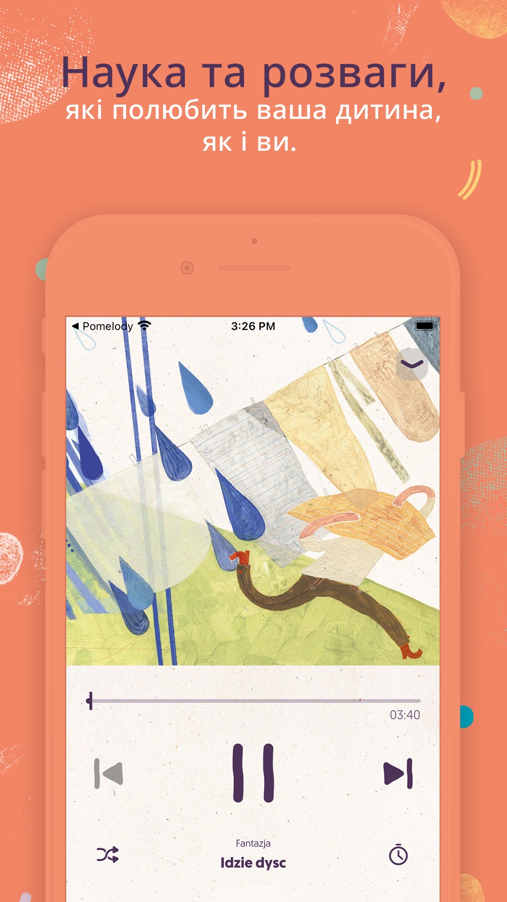 pomelody допоможе тобі попіклуватись про музичний розвиток твоєї дитини. Застосунок не передбачає обов’язкового використання екрану, щоб забезпечити максимально врівноважений розвиток твоєї дитини ми акцентуємо увагу саме на аудіо контенті. Ви можете просто вмикати пісні і гратись, співати, повторювати дитячі віршики, слухати казки, танцювати і просто весело проводити час разом.