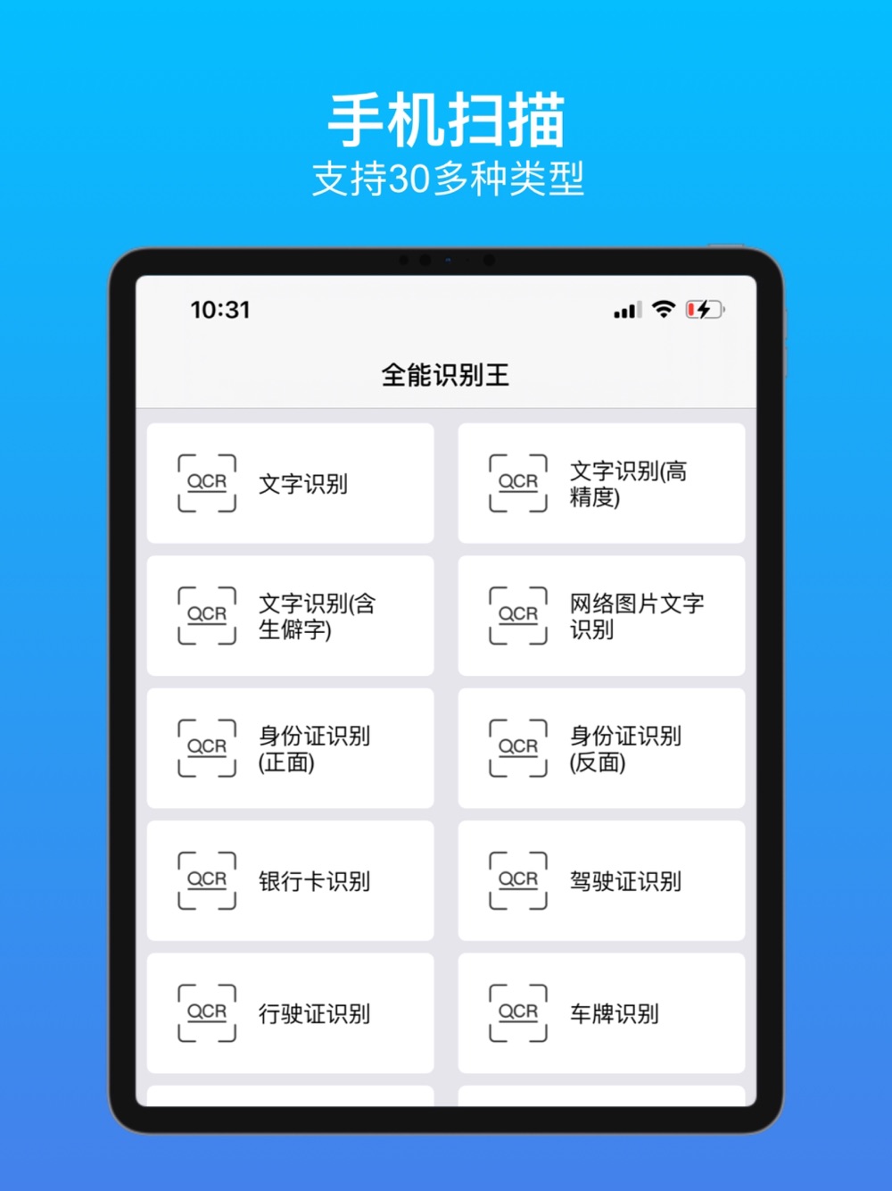 全能识别王是一款功能强大的扫描软件,提供文字、证件、银行卡、驾驶证、行驶证、车牌、营业执照、票据、车票、发票识别等实用功能。软件利用先进的图像识别技术,可以快速、高效的处理各种文档,是您的工作、学习的超强好帮手。
