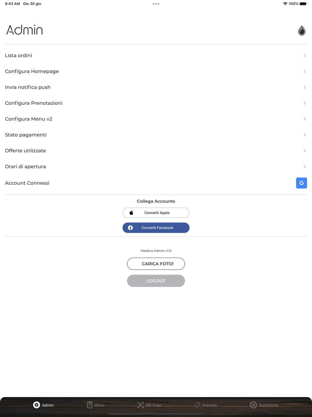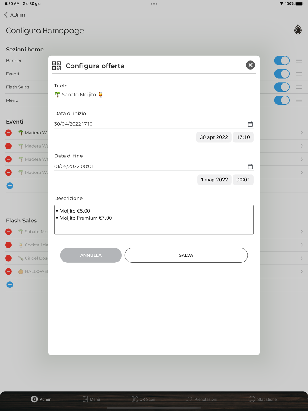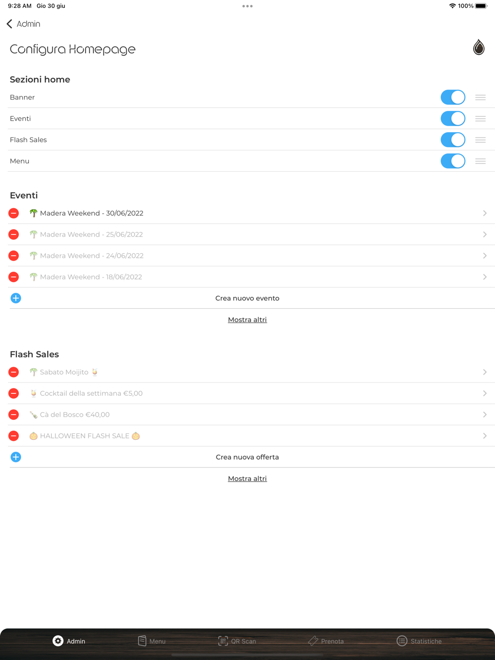 Il pannello da amministratore di Madera Lounge App consente agli amministratore di gestire il proprio locale.