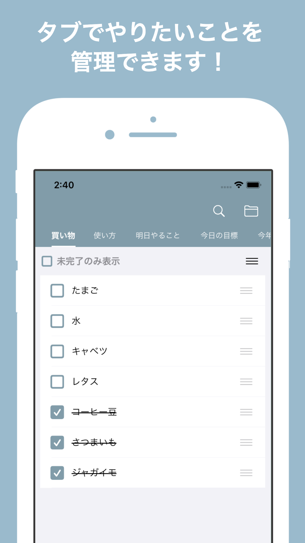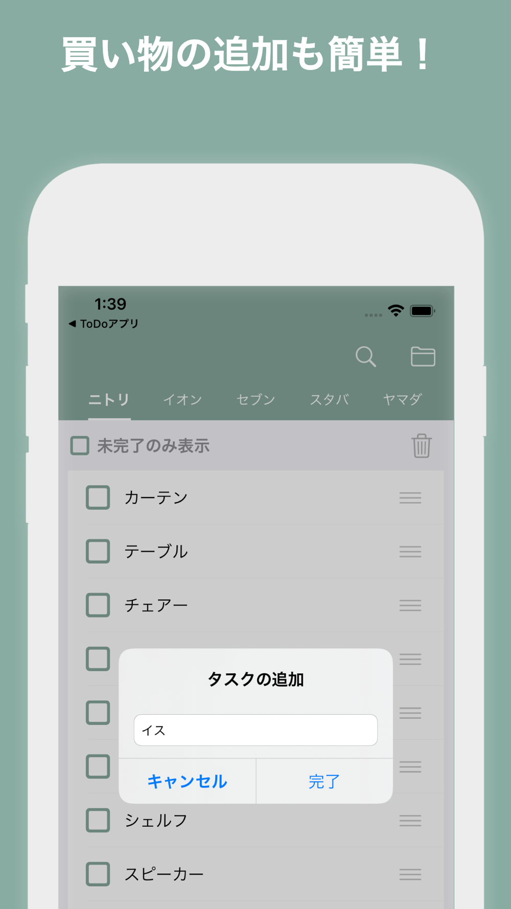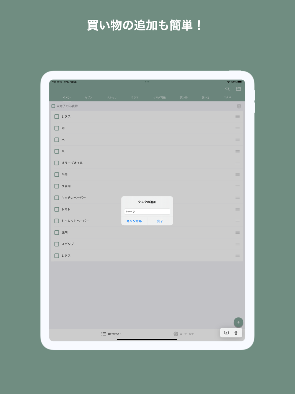【タブでカテゴリー分けして買い物リストを管理可能】