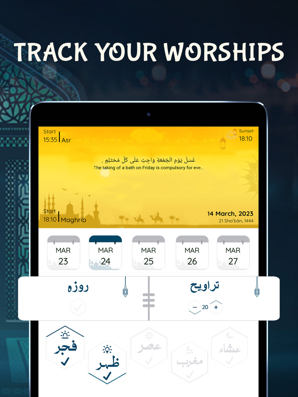 - Ramadan Fasting Track (to log your daily fasting)