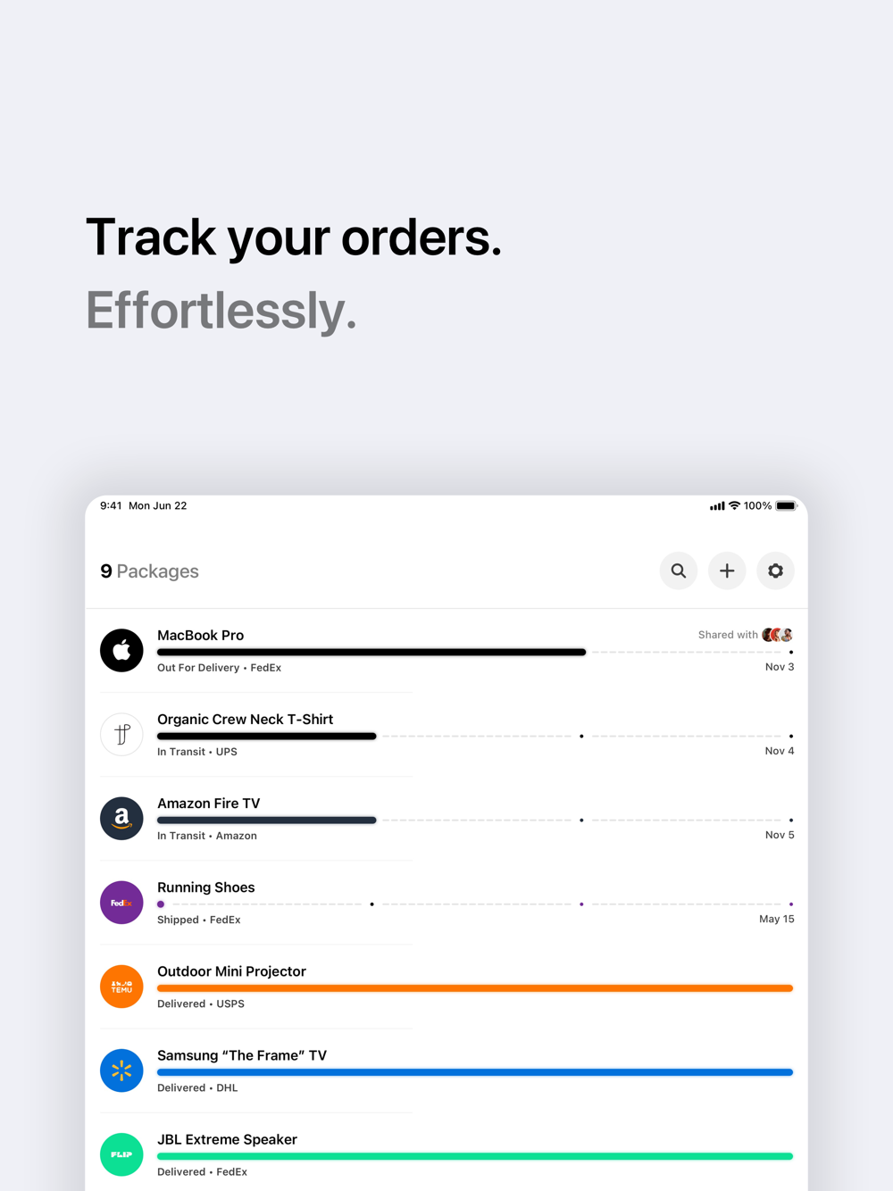 • Add your own tracking numbers to manually track orders not linked to your email.