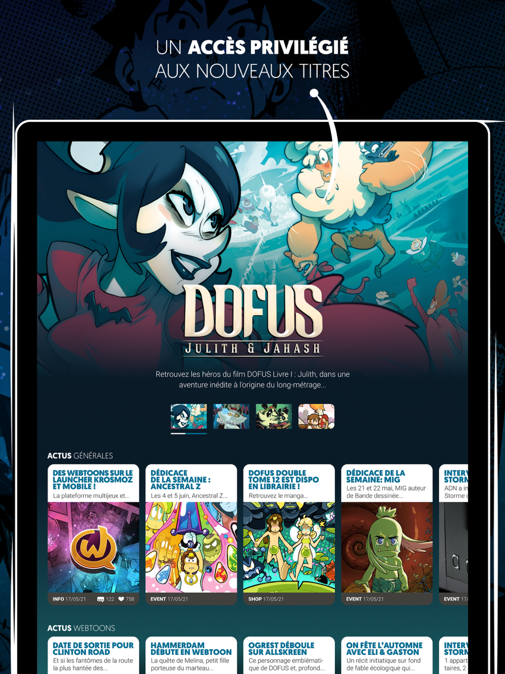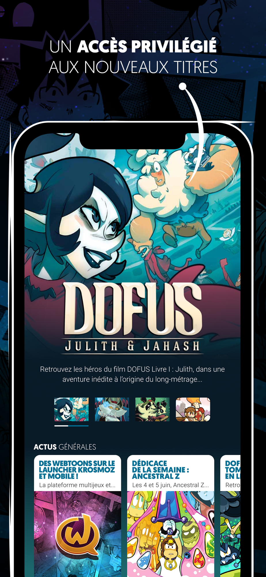 En plus, KROSMOZ est connecté à Ankama Launcher, le portail multijeu d’Ankama : tu as accès à toutes les news d’Ankama, mais aussi à des annonces et des avant-premières qui concernent tes webtoons et les titres à venir.