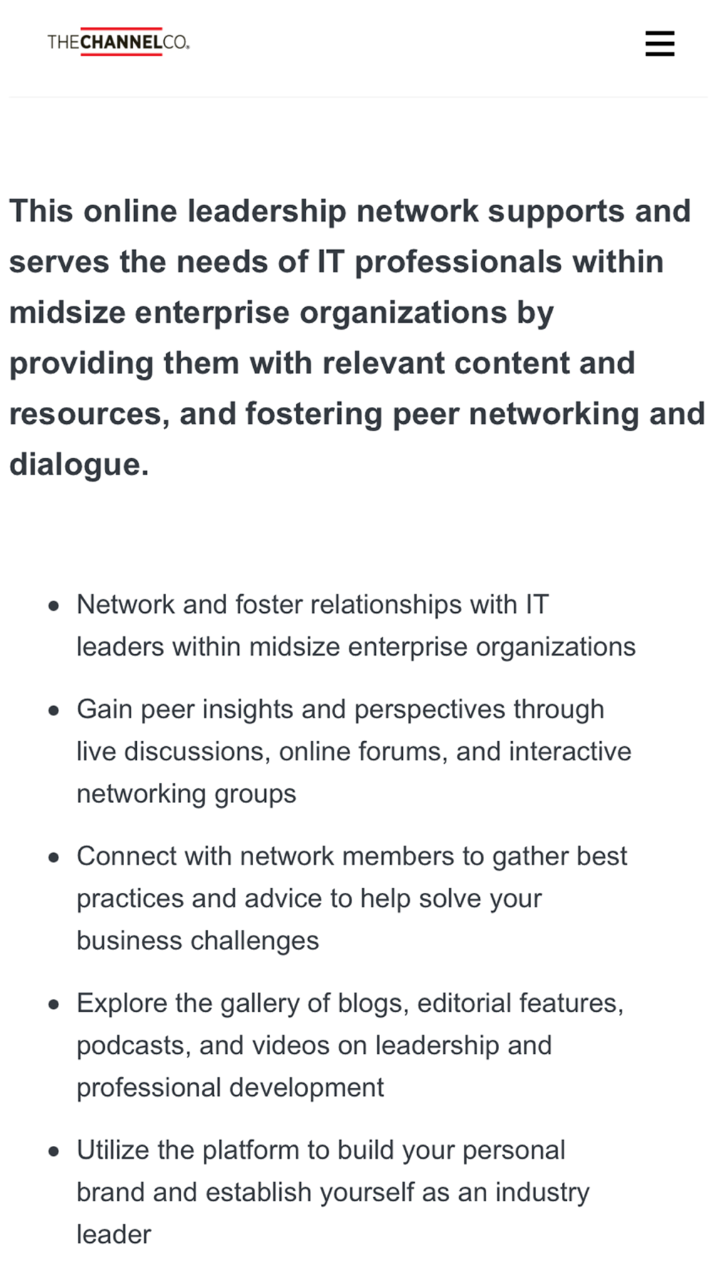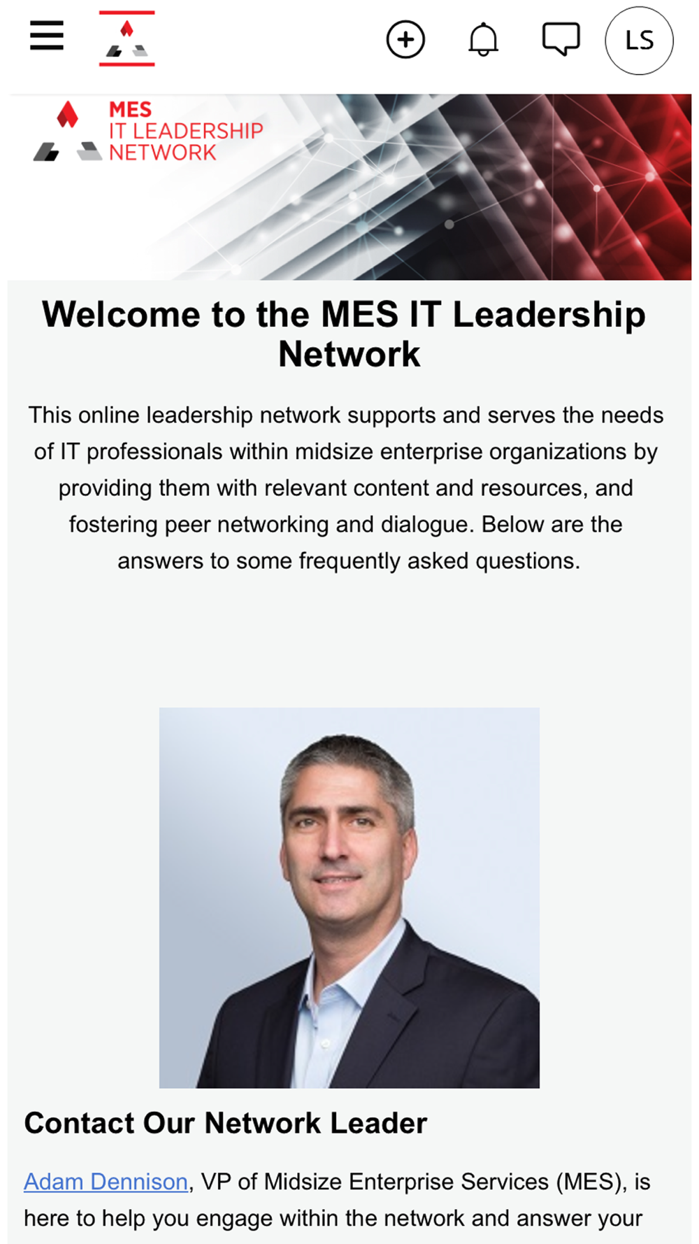 The MES IT Leadership Network Community connects IT leaders in midsize enterprise organizations to relevant content and networking opportunities. Download the app to participate in our member-based community to make connections, strengthen relationships, and tap into a wealth of MES resources to advance your career.
