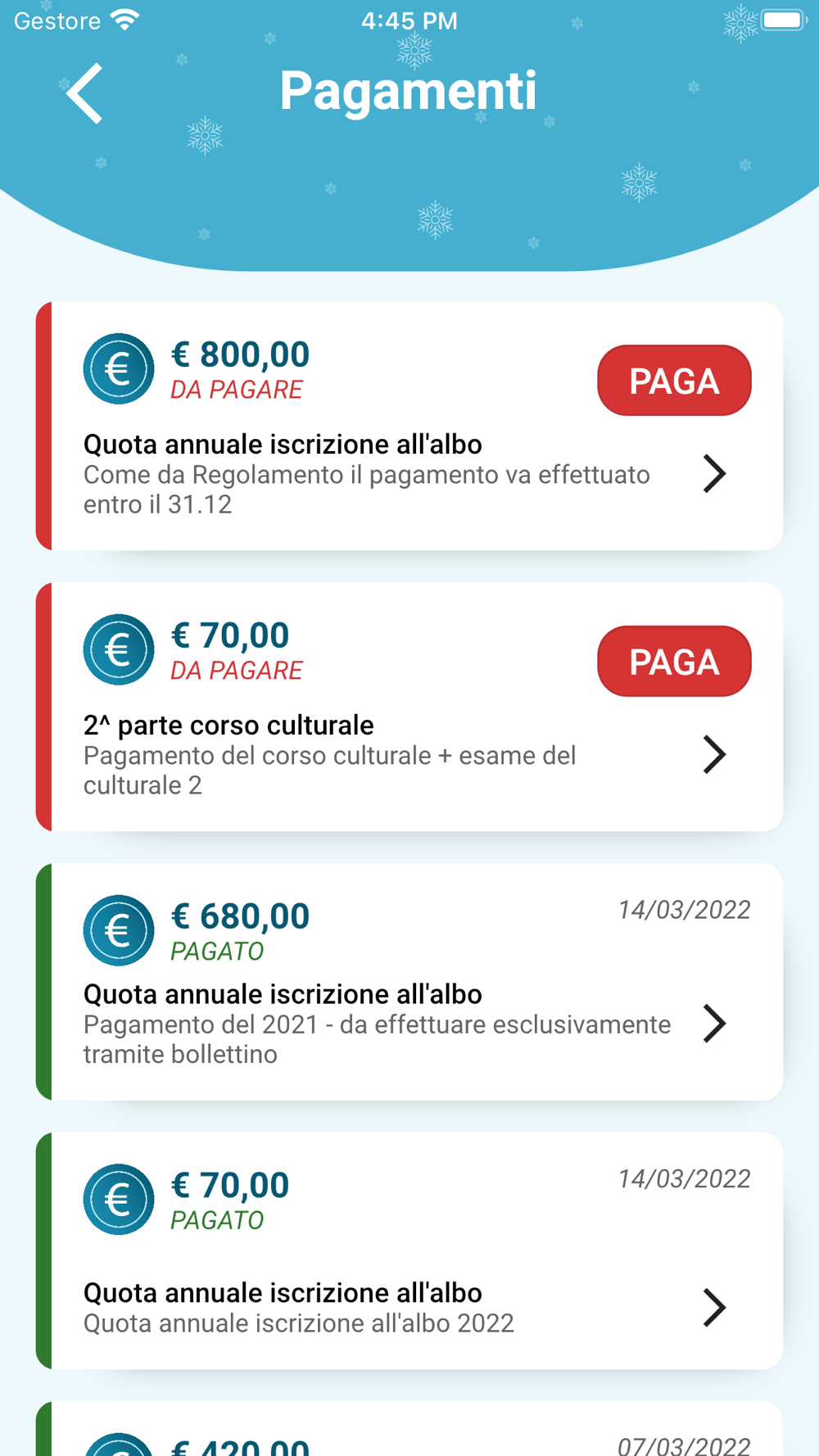 Il maestro, dall'app, ha la possibilità di consultare la propria tessera, e segnalare al Collegio Maestri di Sci Trentino il pagamento della quota annuale.