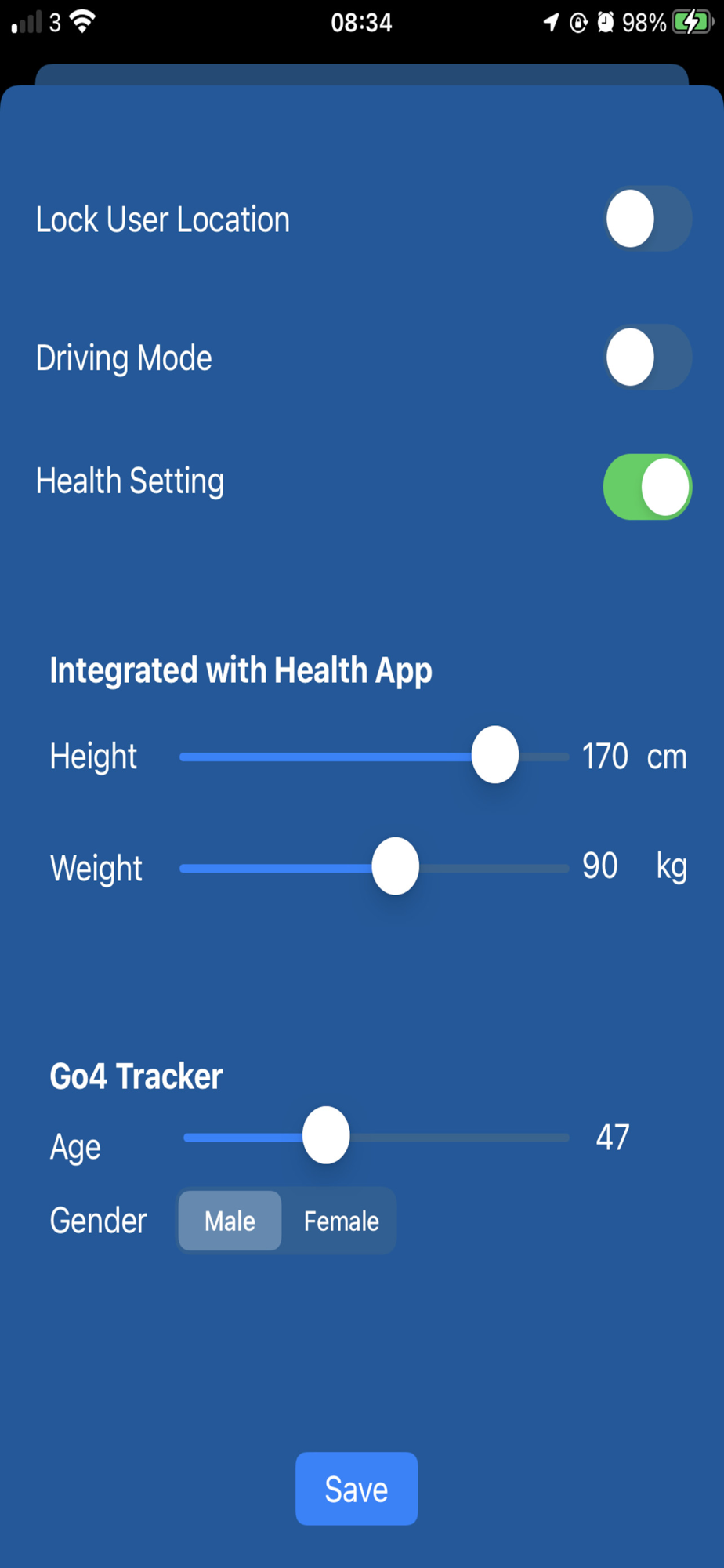 - It reads/writes the most recent height and weight entry from/to healthkit data, calculate the calories burned.