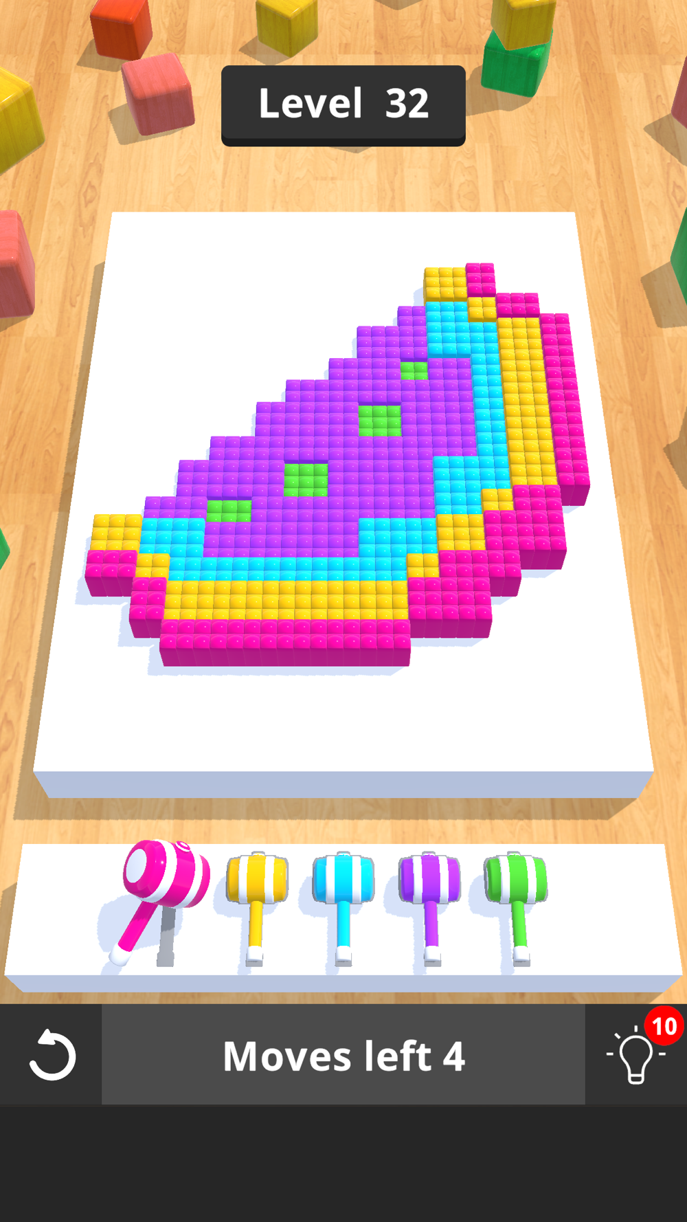 Each level of the game contains cubes of three to seven different colors. Use a coloring hammer of your choice of the color and tap it on a group of the same-colored cubes to apply the color of the hammer to the group of the cubes. Your goal is to keep changing the colors of the cubes till you end up with just one color across the board. Each level will have a limited number of moves in which you have to complete the puzzle. The levels are super quick to finish so that you can play them in the tiniest break available to you in your busiest schedule. Enjoy the Royale Flush challenges and specially the eye pleasing interactions between cute little hammers and royal cubes.