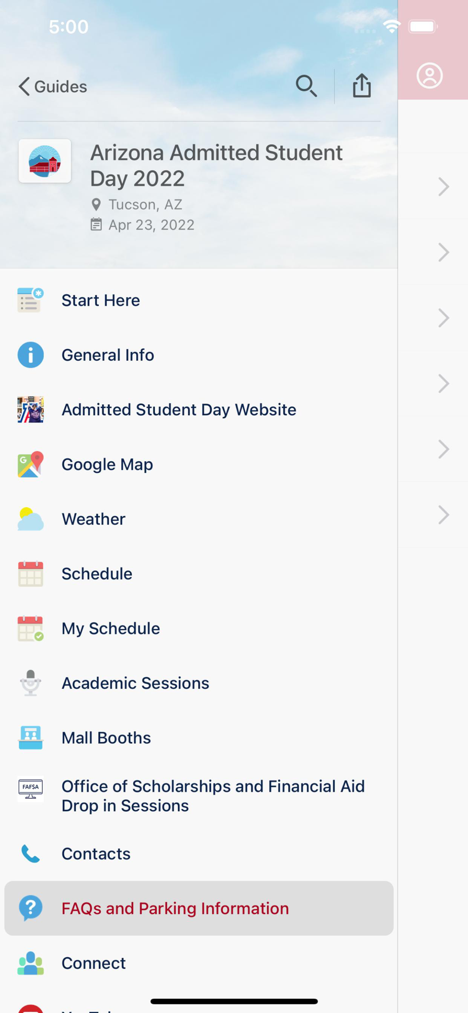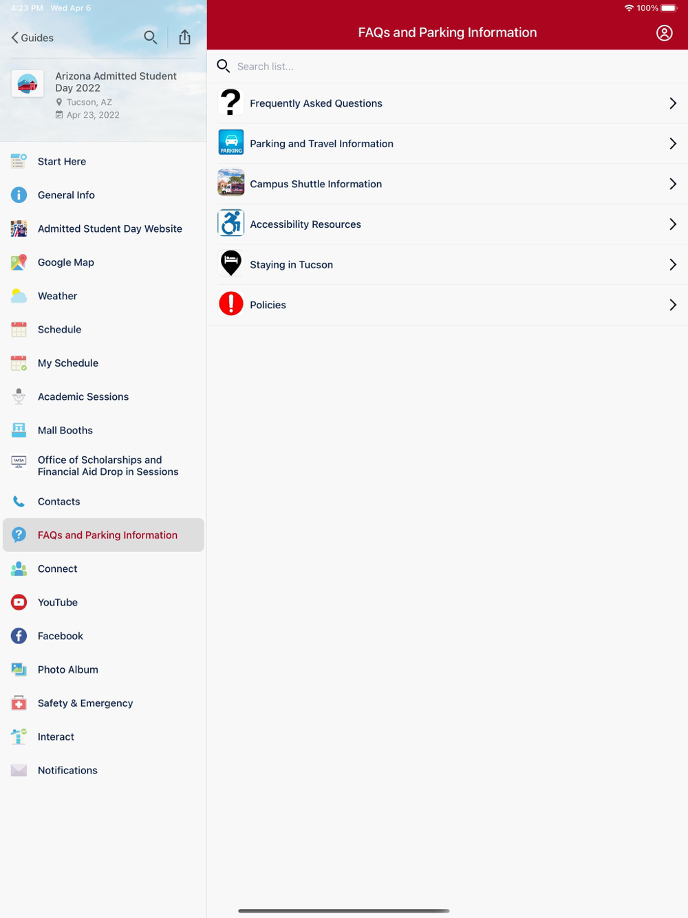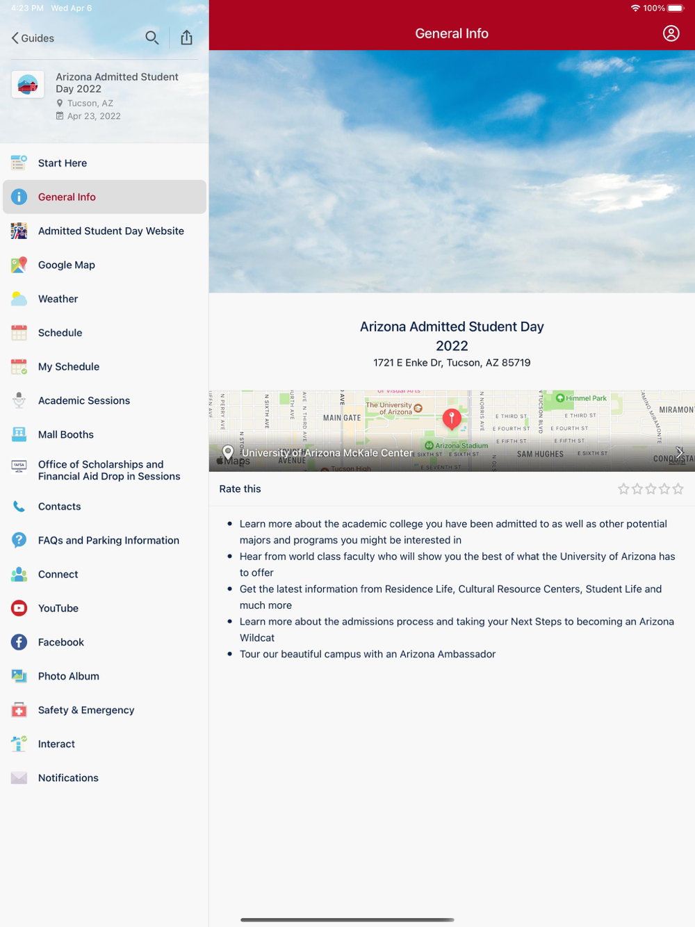 This is the official app for the University of Arizona Enrollment Management Programs such as Admitted Student Day, Destination Arizona, Wildcat Welcome and Family Weekend. With a simple download, you'll gain access to the latest schedules, maps and other relevant information intended to help you get the most out of your experience with us.