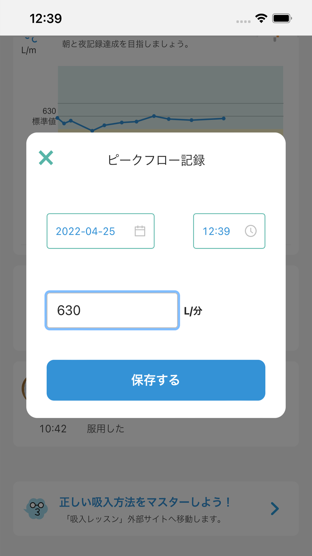 毎日のピークフロー値を記録して日々の変化が見れます。