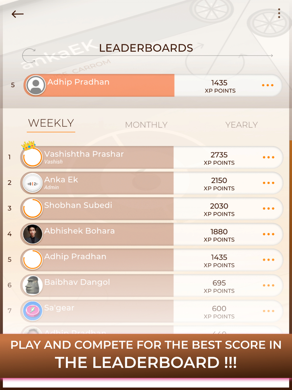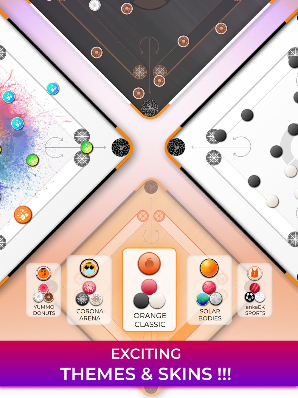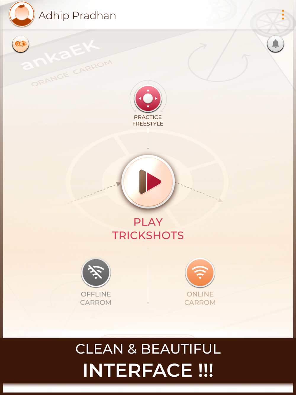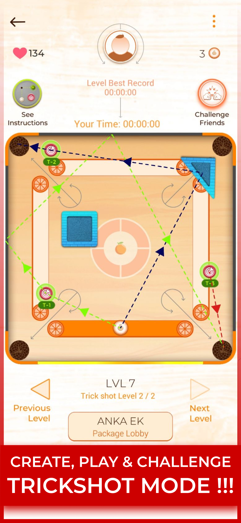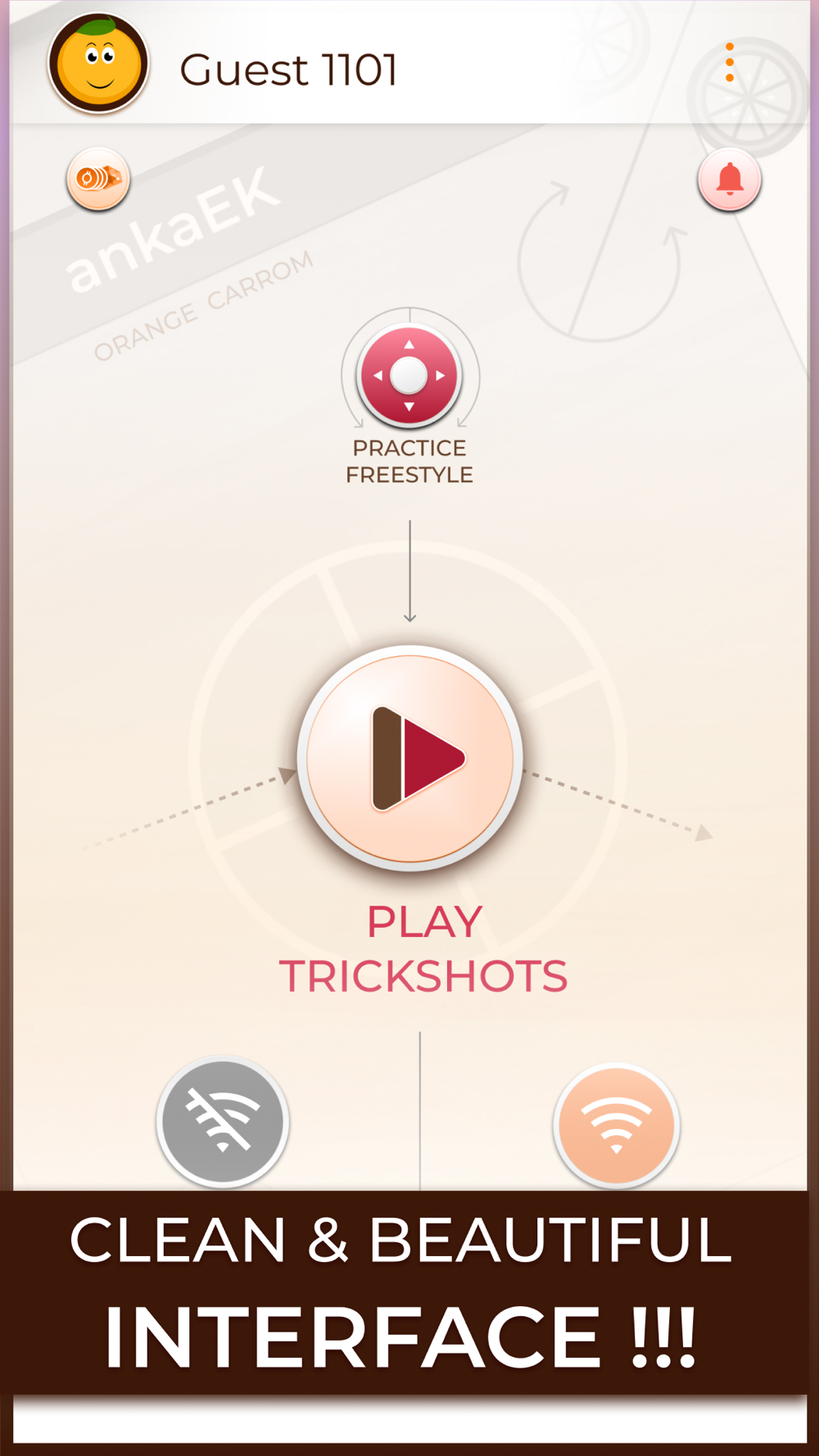Experience the household game of Carrom in a revitalizingly modern graphics and joyfully nostalgic gameplay in Orange Carrom. Whether you are a casual Carrom player who enjoys a classic carrom experience or a mad tinkerer who likes challenging yourself and others with your trickery and wit, Orange Carrom has got you covered. With our Robust Trick Shot mode, the possibilities are limitless, WE DARE you to get bored of it!!! Get ready for the genre redefining experience with Orange Carrom as it will leave you wanting for more, the more you play !!!