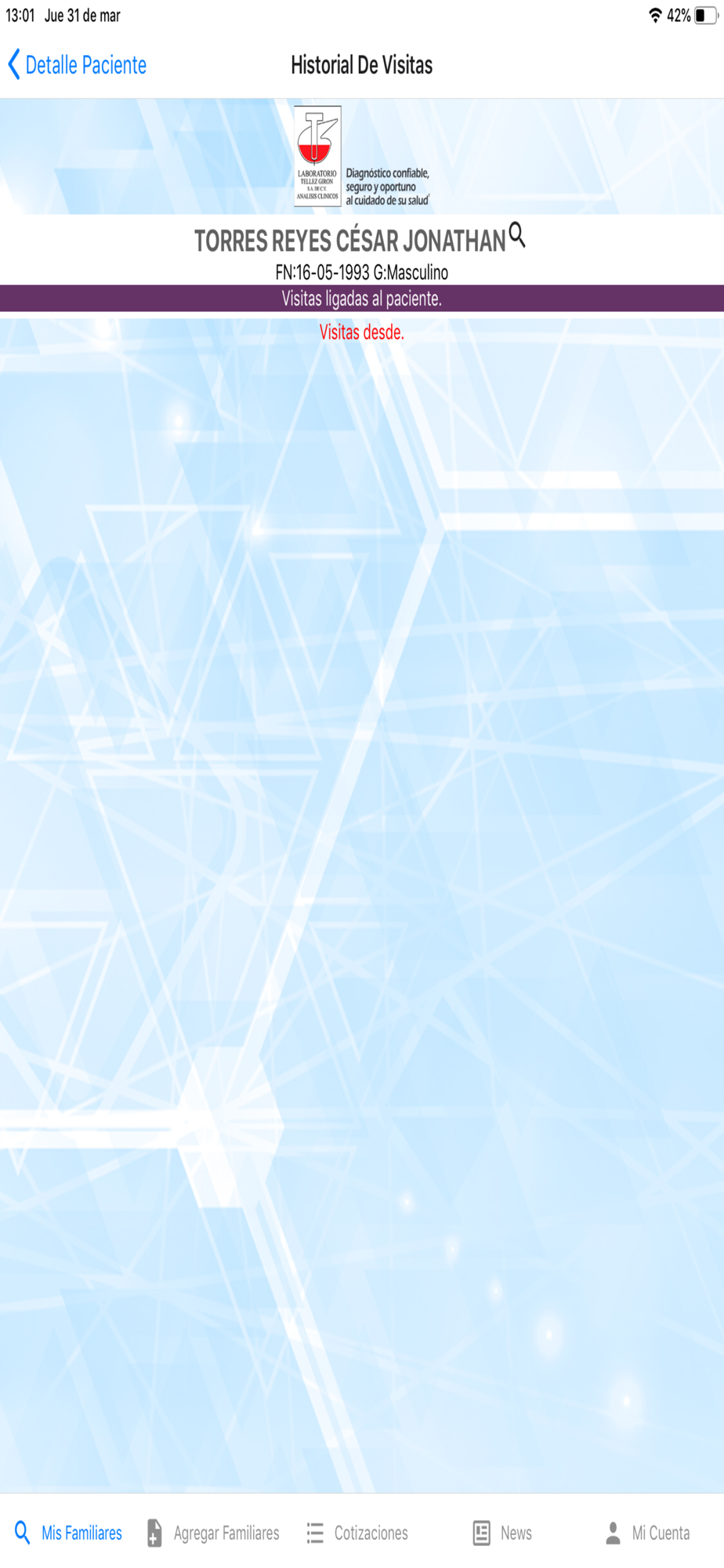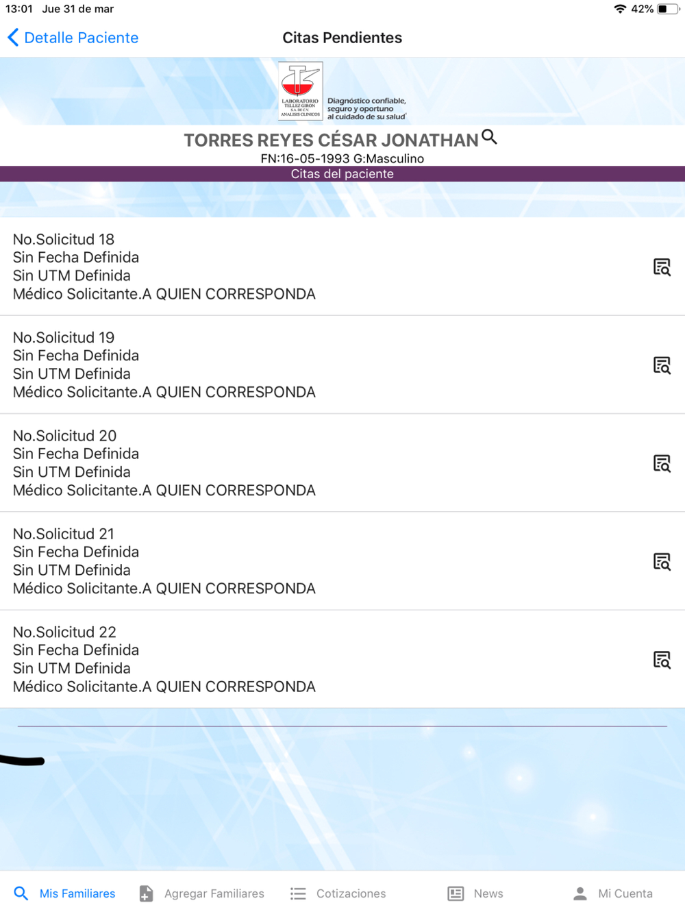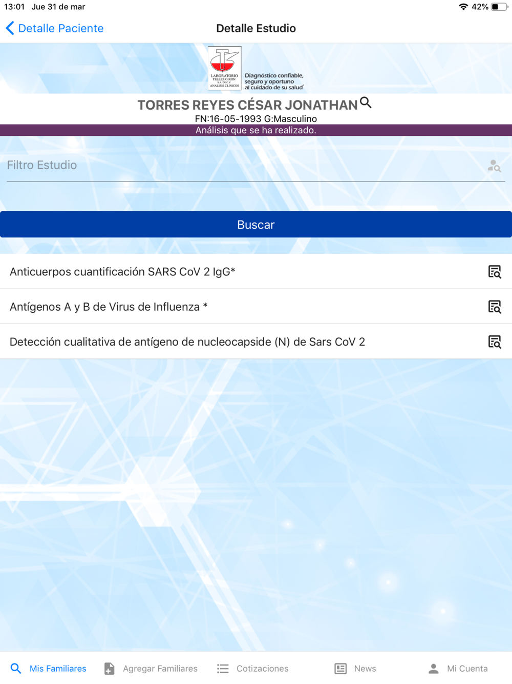 Es una herramienta de fcil acceso para los pacientes donde podrn realizar la consulta de sus resultados ya sea por visita o por tipo de anlisis y as conocer el histrico clnico y progresivo de sus resultados, incluyendo grficos por anlisis que aportaran una mejor interpretacin al usuario. El asociado principal podr agregar a sus familiares para un seguimiento integral. La aplicacin permitir el registro de usuarios nuevos, as como la adicin de pacientes a una misma cuenta.