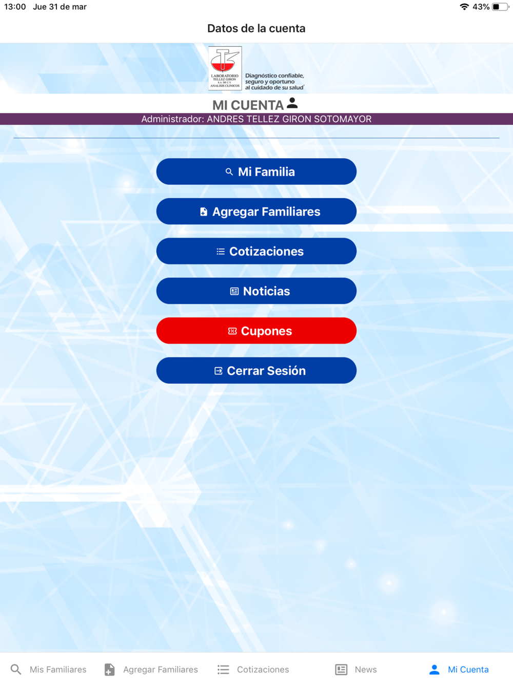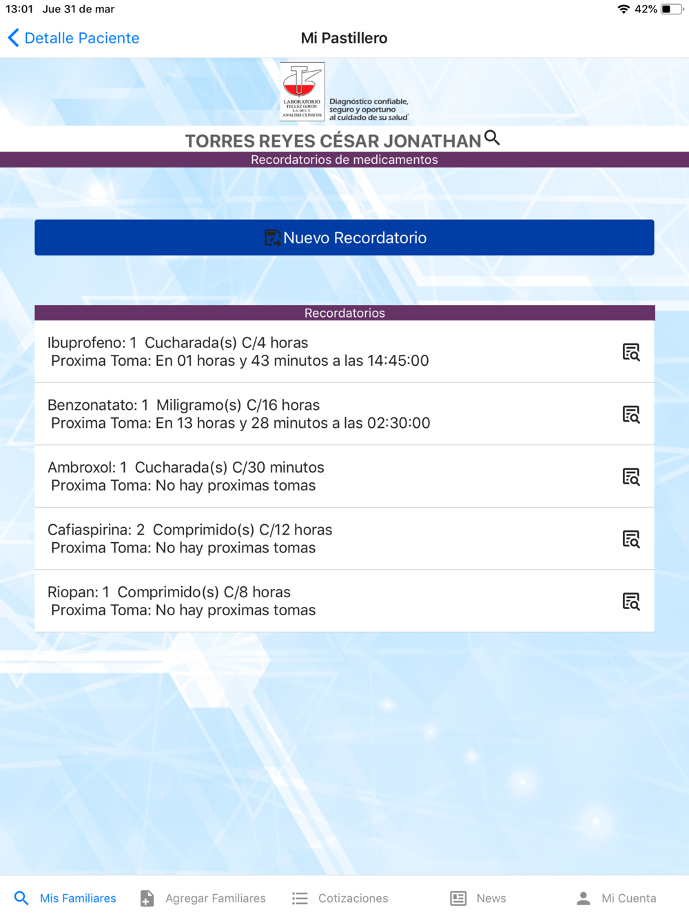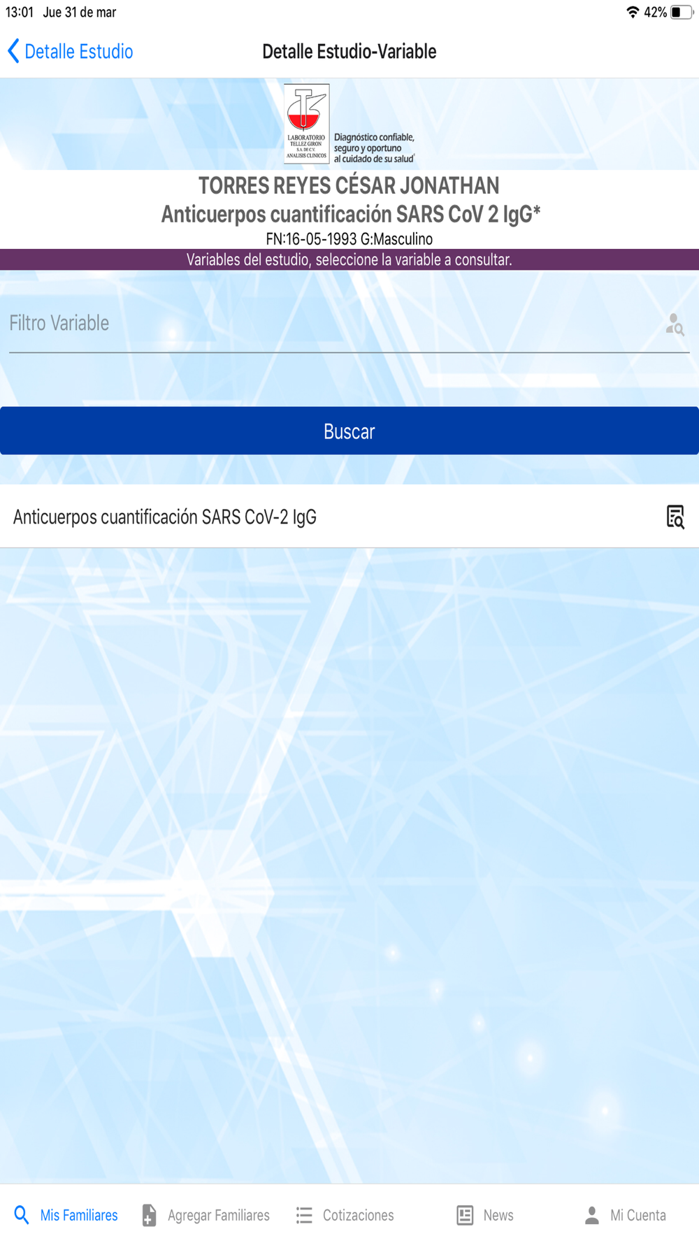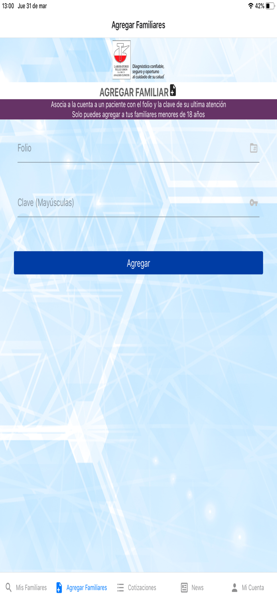 Es una herramienta de fcil acceso para los pacientes donde podrn realizar la consulta de sus resultados ya sea por visita o por tipo de anlisis y as conocer el histrico clnico y progresivo de sus resultados, incluyendo grficos por anlisis que aportaran una mejor interpretacin al usuario. El asociado principal podr agregar a sus familiares para un seguimiento integral. La aplicacin permitir el registro de usuarios nuevos, as como la adicin de pacientes a una misma cuenta.