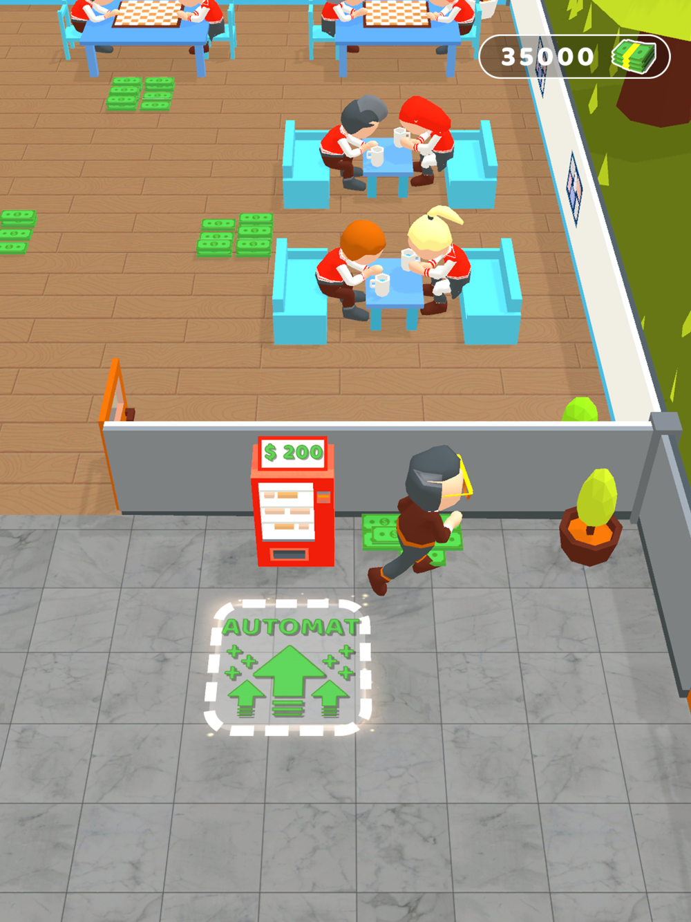 Control via joystick, passive income available at the vending machines and the library.